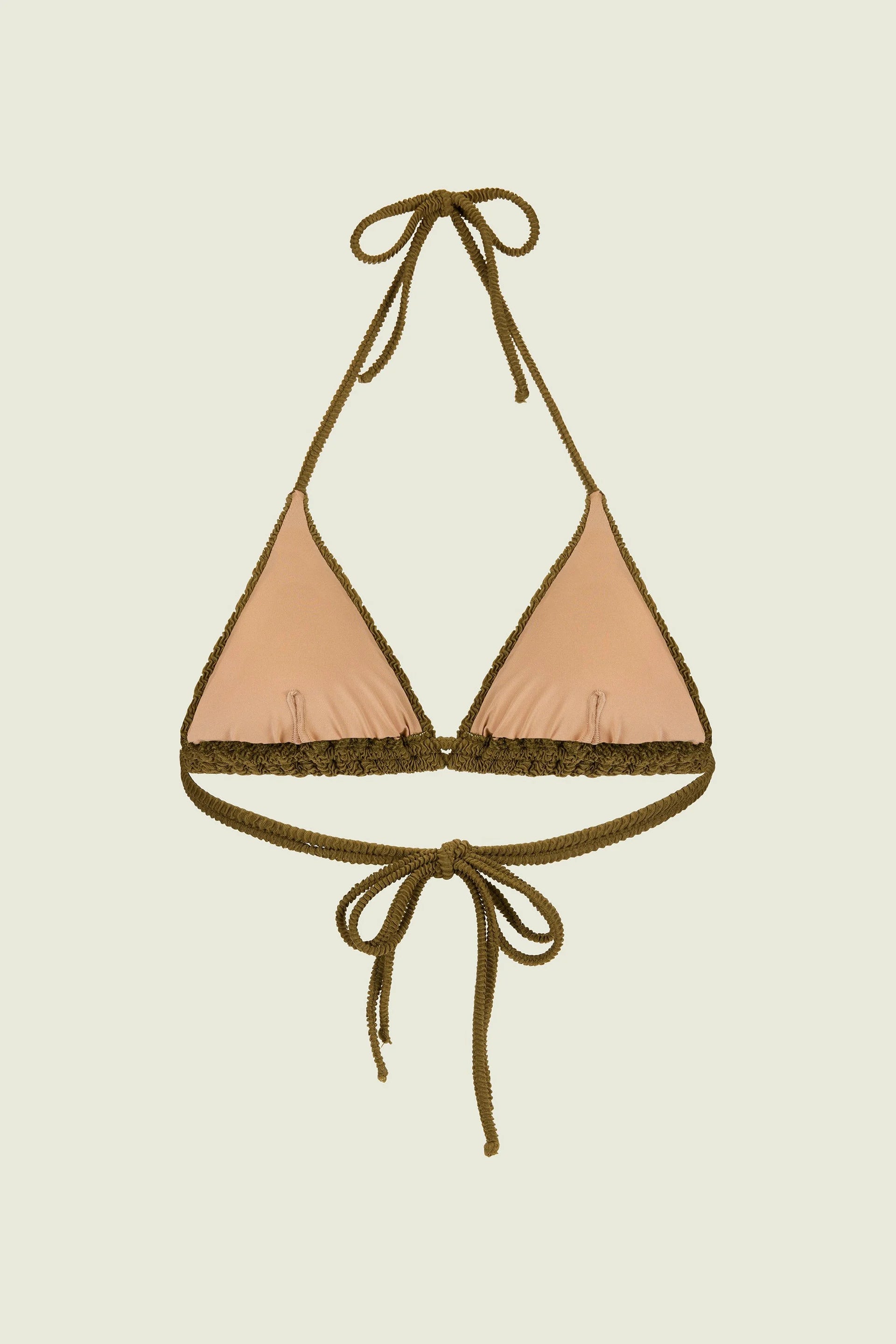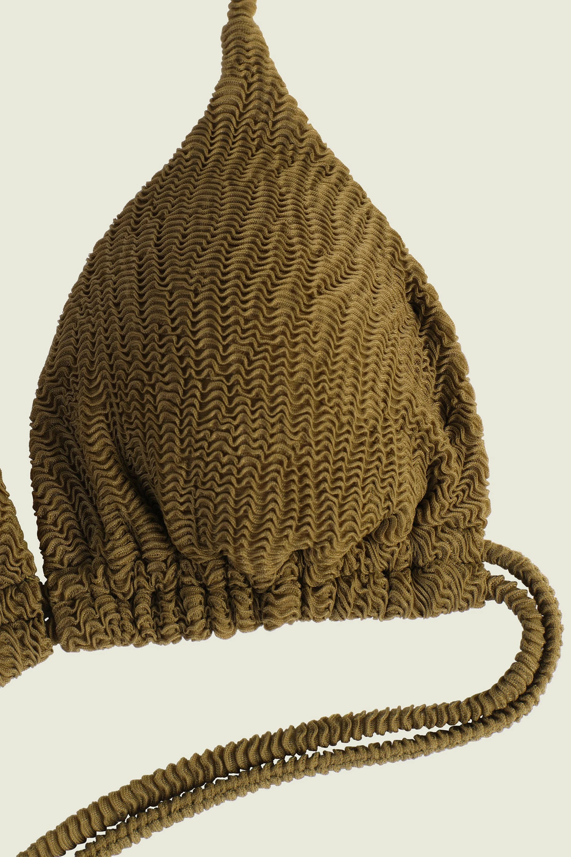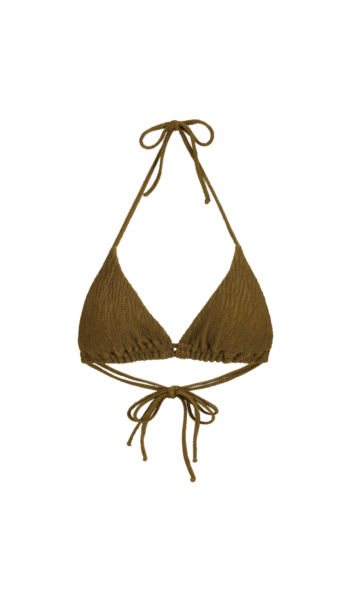 The Khaki Azzura bikini top features a crinkled seersucker fabric that supports and flexes to the natural contours of the body. Made from recycled nylon, it has triangle cups with two sets of straps that tie at the back. Fully lined with removable cups offering gentle support.