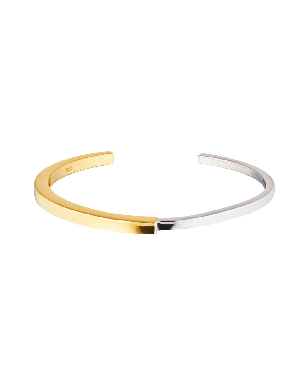 The Dallas Cuff is a stylish bracelet combining polished 18k gold and sterling silver in a two-tone design. Its open-cuff shape and smooth lines create a clean, modern look that easily complements any outfit with a touch of elegance.