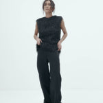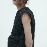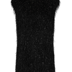 A relaxed silhouette cut from black fringe with metallic tinsel. Subtle