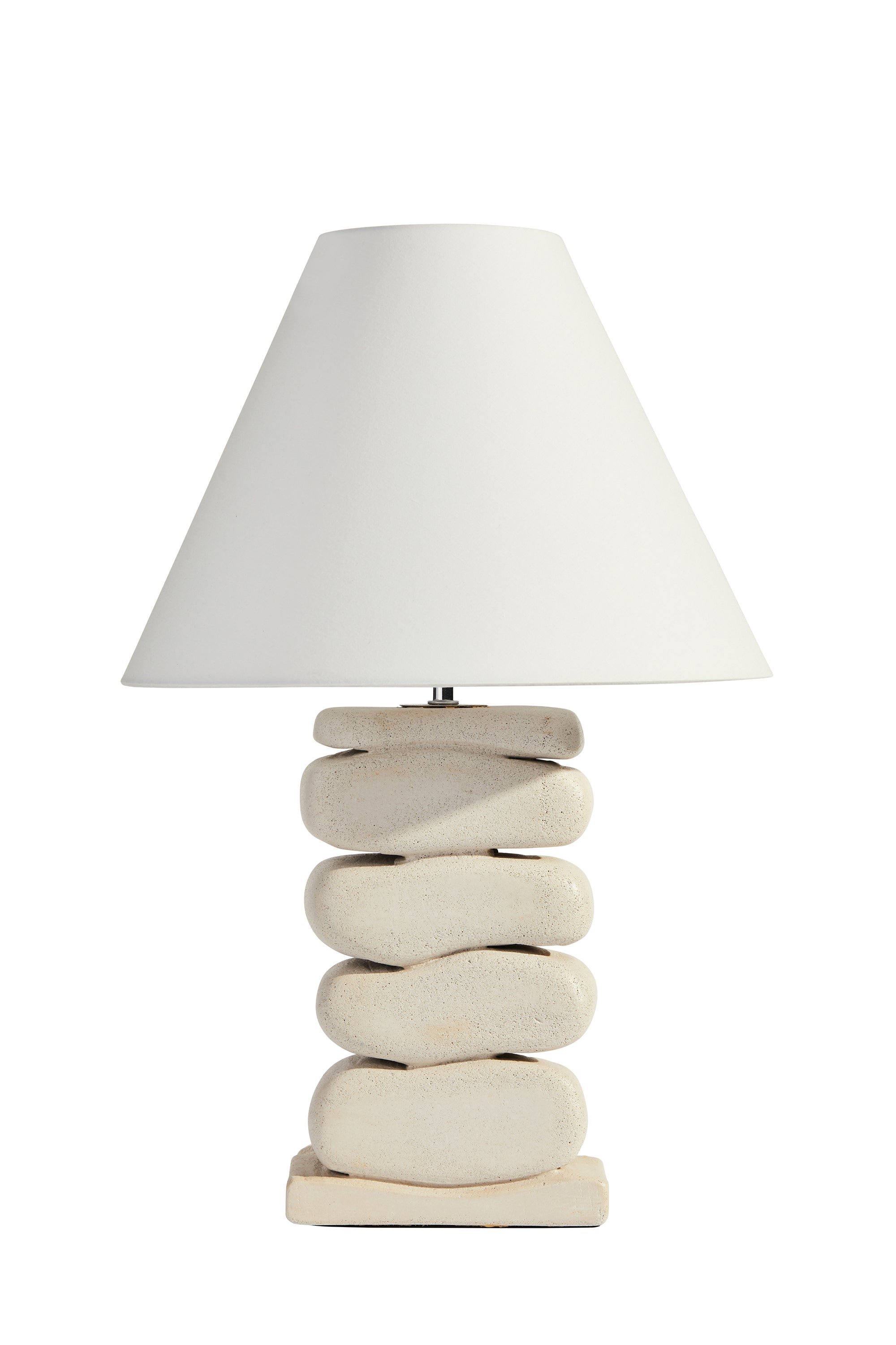 The Bobby Lamp showcases a design inspired by stacked rocks. It stands 60cm tall and 40cm wide, with a base measuring 30cm by 20cm by 10cm. The lamp features a hand-painted linen shade sized 30cm by 40cm and uses a 60W Edison screw E27 bulb. Crafted in Australia, each lamp is handmade and may have slight variations.