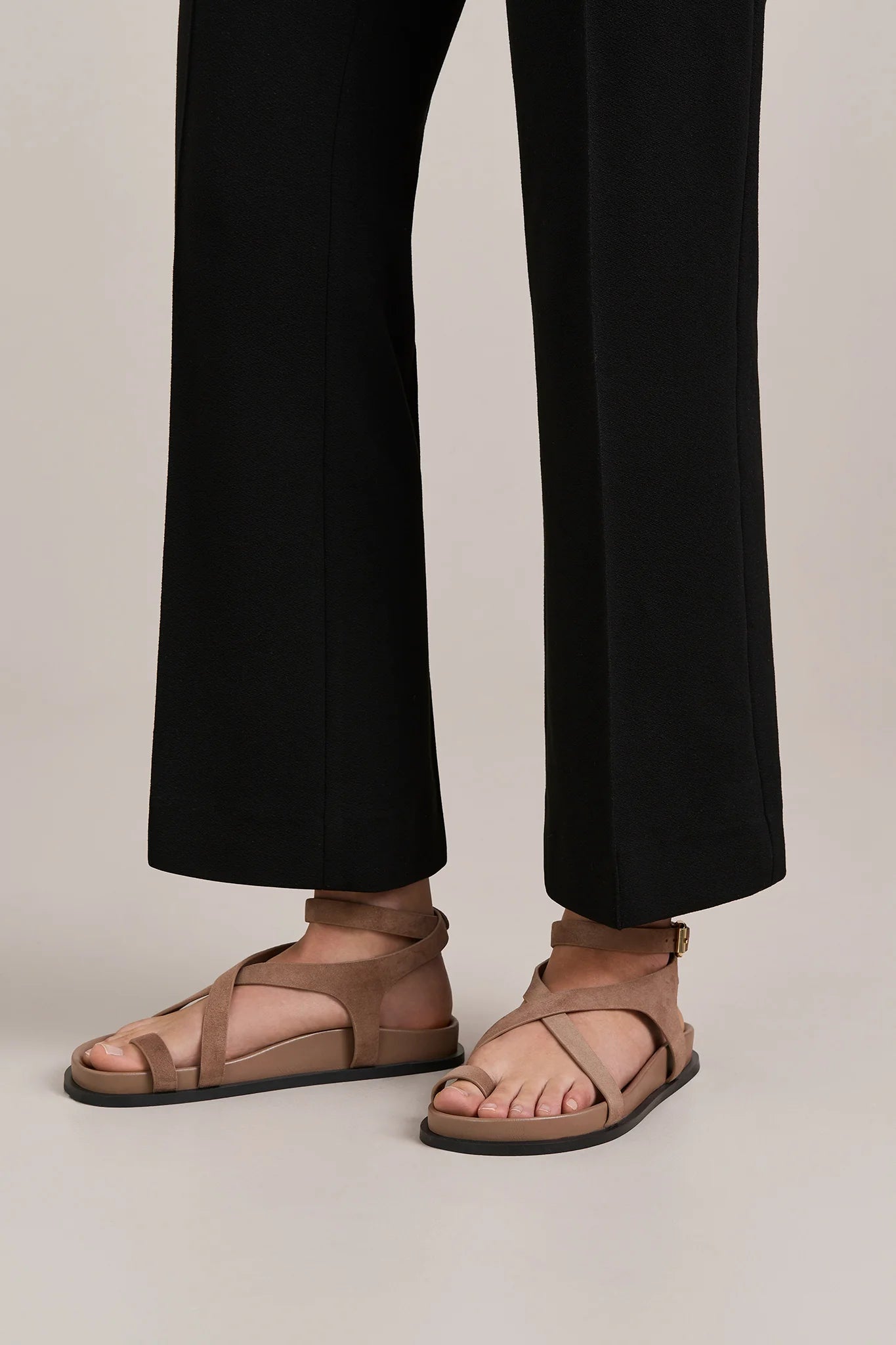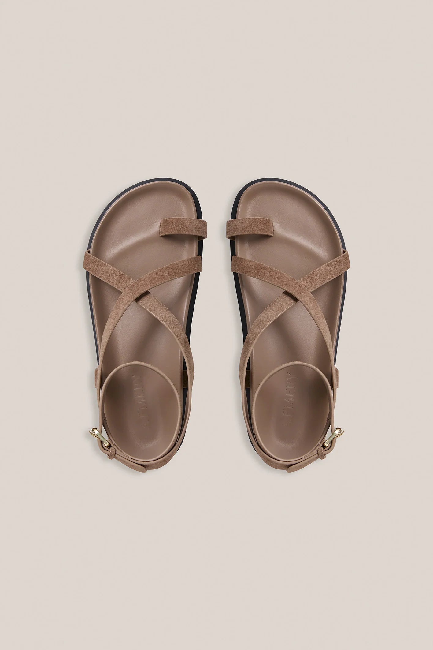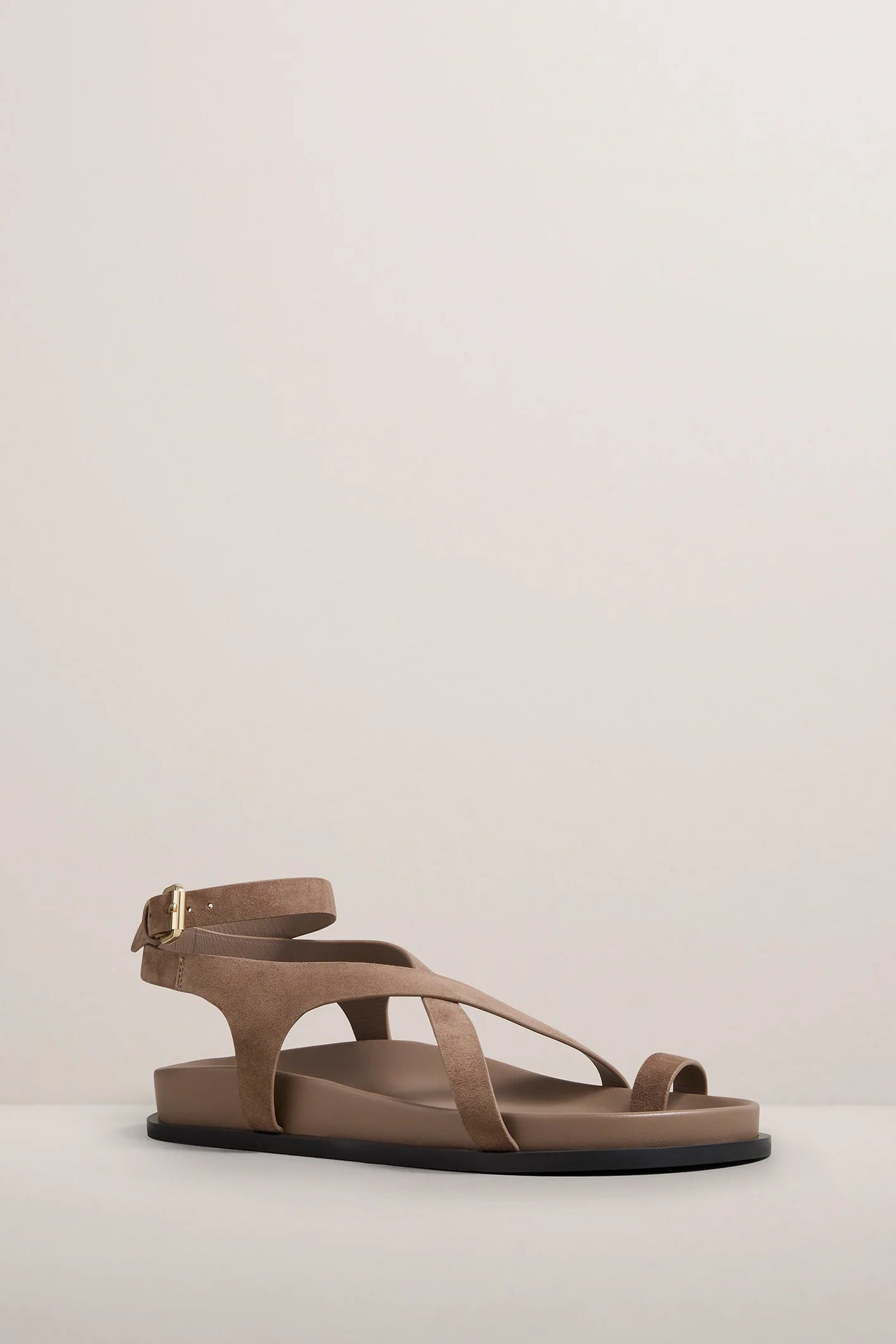 A new offering of the most popular style, the Jalen Slim Sandal by A.Emery sits atop a moulded footbed, featuring a toe hold and two criss-cross straps that encase the foot and finish with a soft gold buckle around the ankle.