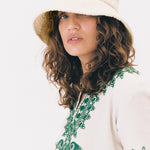 Made from a comfortable cotton blend, the Palm Bucket in Cream features a neutral cream tone that is easy to style with your summer wardrobe. Its brim offers practical sun protection, while the playful tone-on-tone Terry print adds subtle texture and style. Lightweight and breathable, this bucket hat is perfect for sunny beach days, outdoor activities, or casual outings. Easy to pair with your favorite summer outfits, it combines fashion and function for an effortless seasonal look.