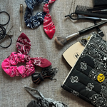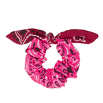 The Fuchsia & Bordeaux Scrunchy reimagines a timeless accessory with flair. Made from 100% cotton, it offers a soft yet sturdy grip that treats your hair gently. Handmade in the USA, each piece is one-of-a-kind, featuring subtle dye variations from unique dye baths. Its deep navy background paired with vivid real red highlights delivers a bold statement, perfect for elevating everyday looks or adding sophistication to special events. Crafted from leftover bandana fabric, each scrunchy is sold separately.