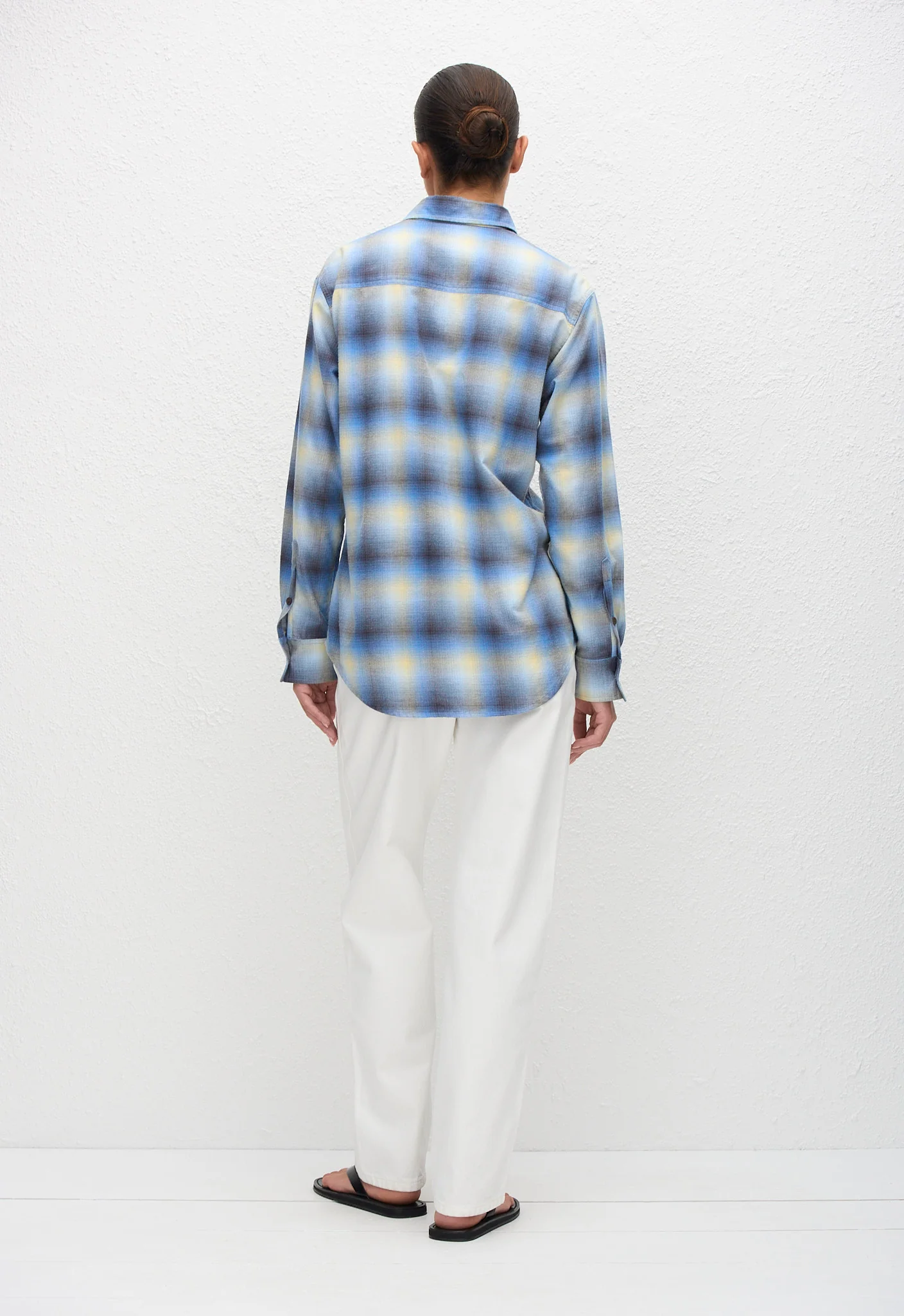 Cristina is 178cm and wears the Flannel Shirt in Ocean Check in a size 2. This style is true to size, take your regular size.