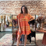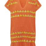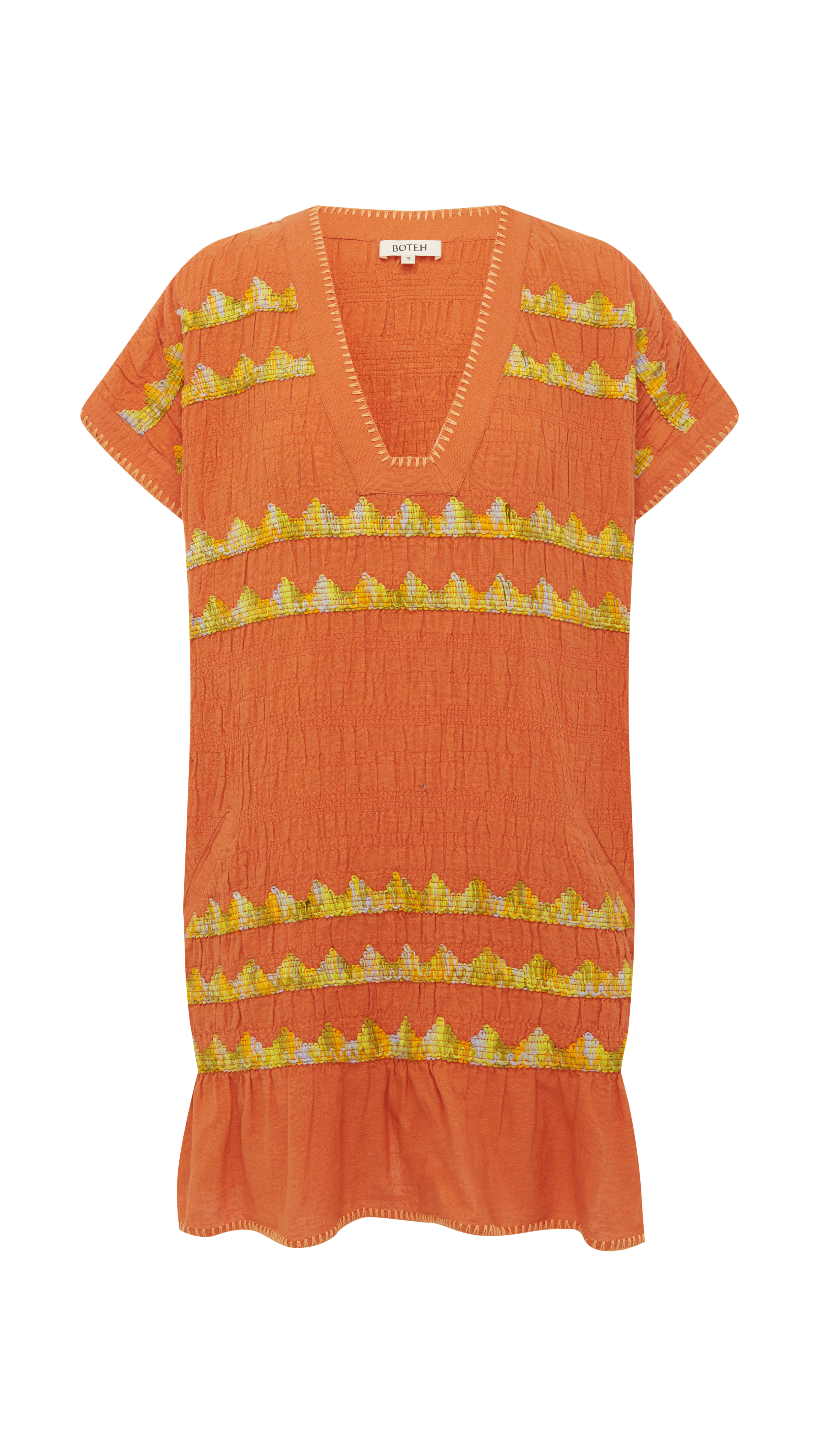 The perfect companion for sun-soaked days, this mini-length tunic effortlessly transitions from beach to boardwalk. Distinctive applique smocking adds visual interest, while delicate hand blanket stitching frames the edges with artisanal charm. Practical front pockets keep essentials within reach, making it as functional as it is fashionable. Your go-to layering piece for endless summer styling.