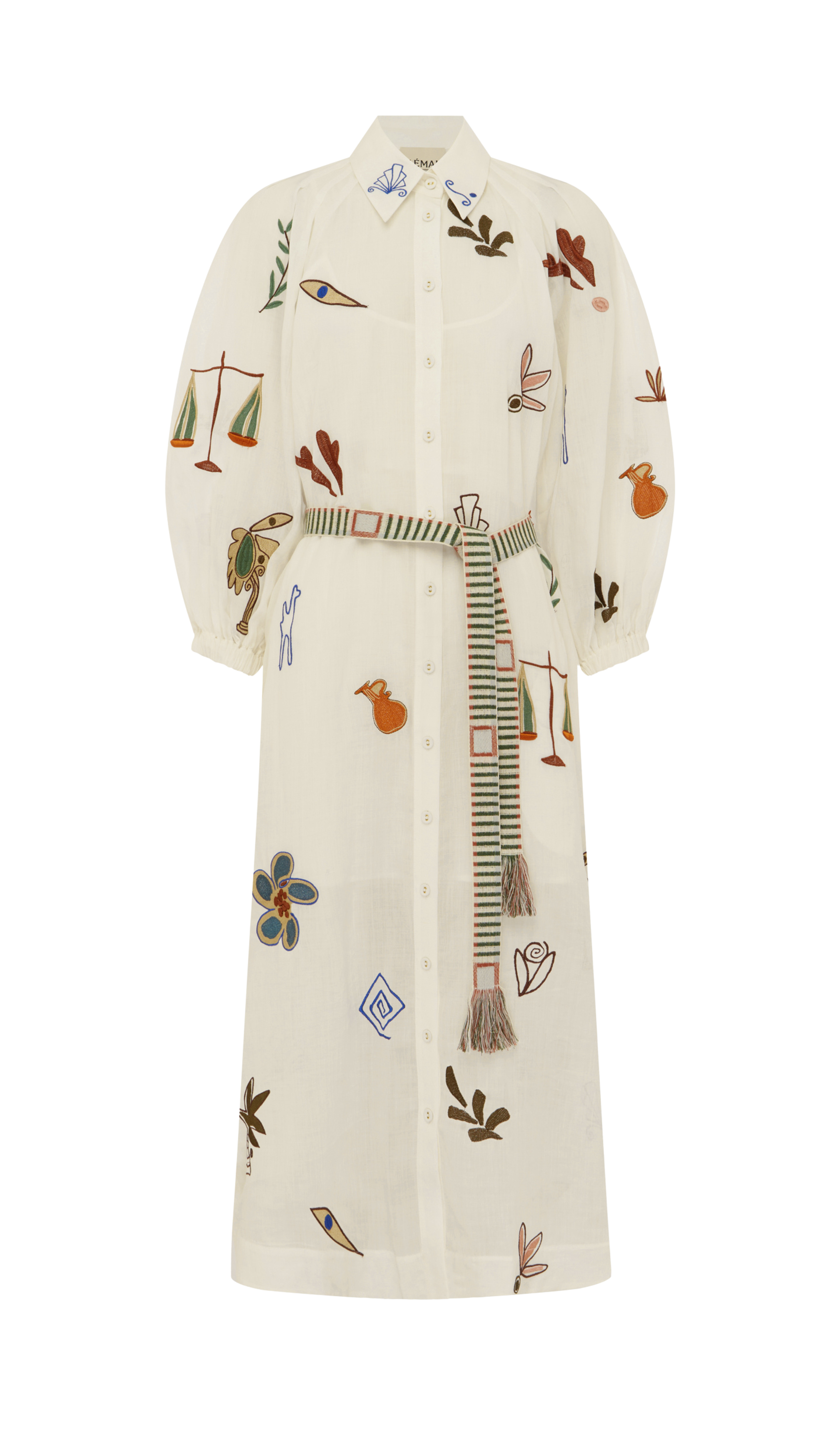 Elevate your wardrobe with the Mina Embroidered Shirtdress, featuring exclusive artwork created in collaboration with Laurence Leenaert. This dress offers a relaxed shirtdress silhouette that combines comfort with effortless style. Detailed embroidered motifs add a unique, artistic touch to the fabric, while the pointed collar and stand lend a refined finish. The front placket is adorned with self-covered buttons for a seamless look, and elasticated cuffs provide subtle volume and ease of movement. Complete with a jacquard belt, the dress allows you to accentuate your waist and create a flattering, tailored fit suitable for any occasion.