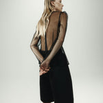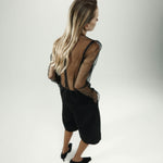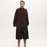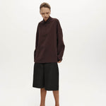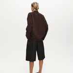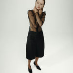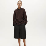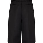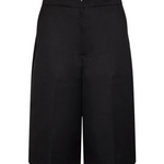 Tailored shorts cut in black satin with an exposed front zip detail. Cut with a structured waistband and a wide-leg silhouette. Intended to sit on hips, however the elongated rise allows flexibility. Falls just below the knee.