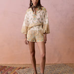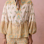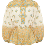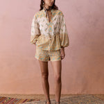 The Jardin Smock Shirt brings vibrant garden-inspired elegance to your wardrobe with its gardenia-white base adorned by airy florals and framed borders in rich ochre, jewel azure, and olive tones. Crafted from delicate organic voile and linen layers, this blouse offers a refined visual texture and exceptional breathability. Its signature smock style features a flattering waist channel with tie detail, enhancing your silhouette with ease. Soft elastic at the sleeve cuffs provides a comfortable fit while adding subtle shape. Perfect for stylish layering or wearing alone, this shirt seamlessly blends sophistication with everyday comfort.