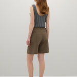 The Keely Short, made from premium Turkish wool, offers a chic tailored fit with pintuck detailing on both front and back legs, complemented by belt loops and unique cutaway pocket accents. Due to its delicate fabric, it’s best to avoid rough surfaces and be cautious with jewellery and accessories to maintain its pristine condition.