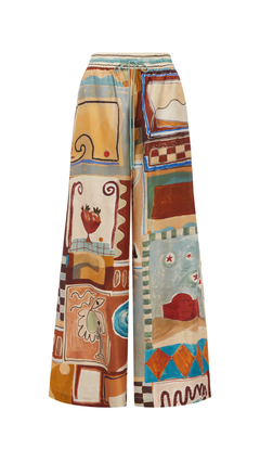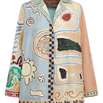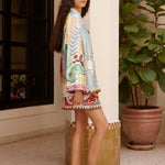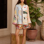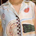 The Michelle Silk Shirt is a refined piece featuring exclusive artwork created in collaboration with Laurence Leenaert, adding an artistic flair to your wardrobe. Crafted with a relaxed silhouette, it offers effortless comfort and a modern look. The camp collar enhances its casual yet polished style, perfect for both day and evening wear. Finished with self-covered buttons, this shirt combines a sleek design with subtle detail, making it a versatile addition to any stylish collection. Elevate your outfit with this elegant and contemporary silk shirt.