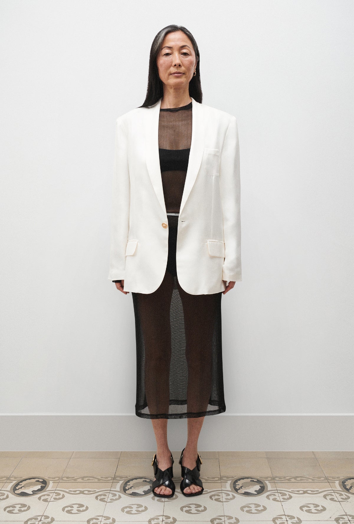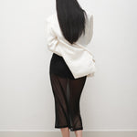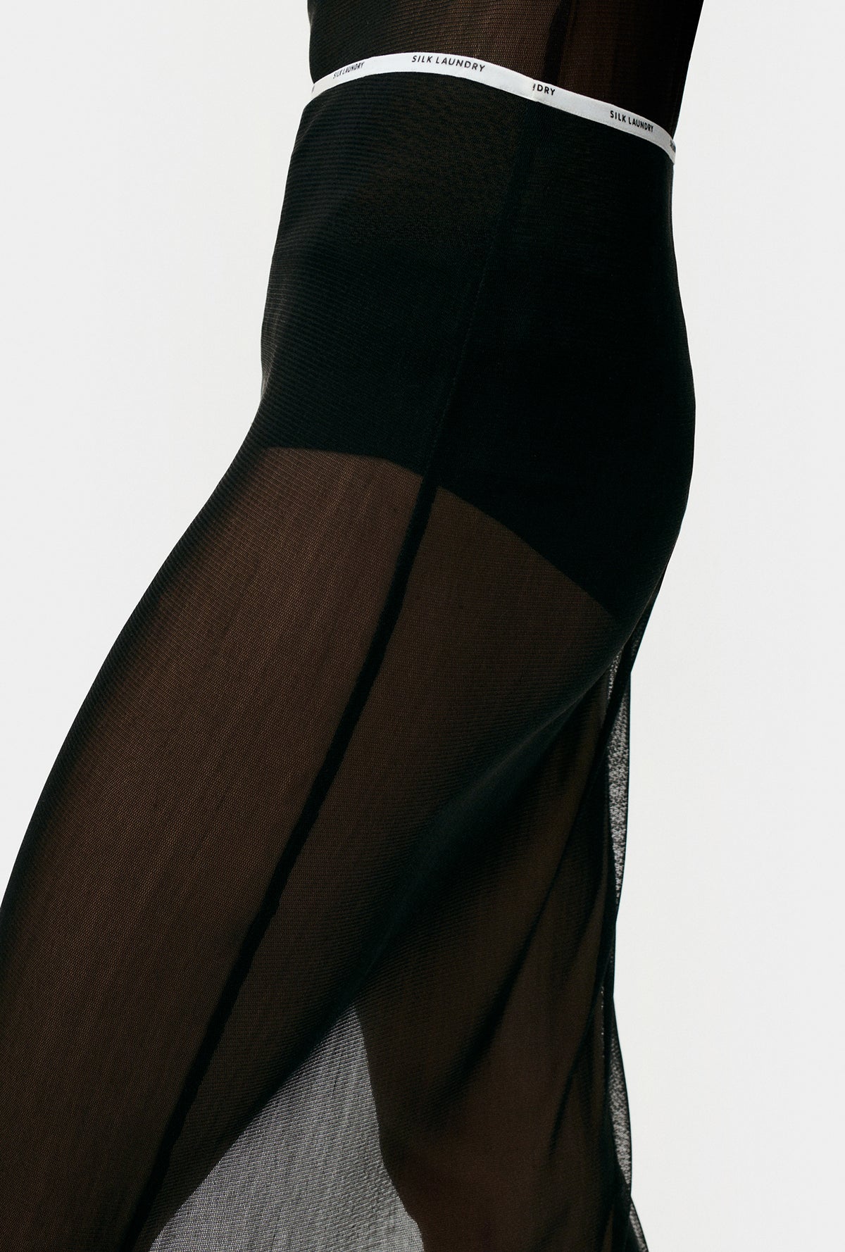 The Mesh Skirt - Black is made from 100% silk sheer mesh, featuring a high-waisted fit and an elasticated waistband. It can be styled on its own or perfectly paired with the Cropped Cardigan.