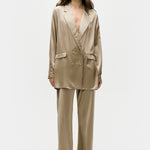 The Relaxed Blazer by Silk Laundry is cut with a loose silhouette and left unlined, the Relaxed Blazer defines soft suiting. A deep collar, silk-covered double-breasted button closure, and flap pockets reference classic menswear. Fluid silk drapes to create a distinctly elegant, feminine shape. Pair it back perfectly with our Bias Cut Pant to offer the best in refined elegance for an occasion to match.
