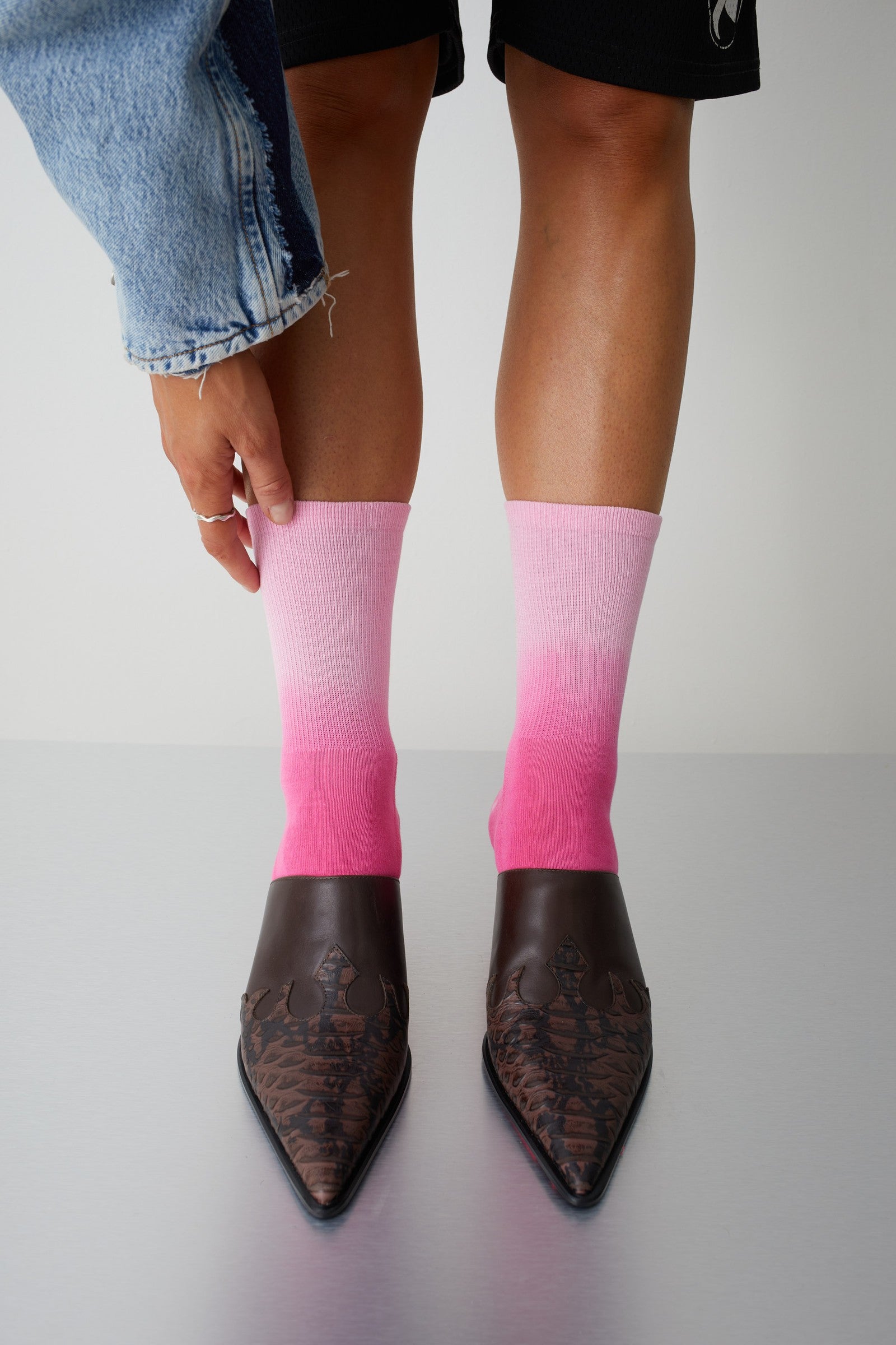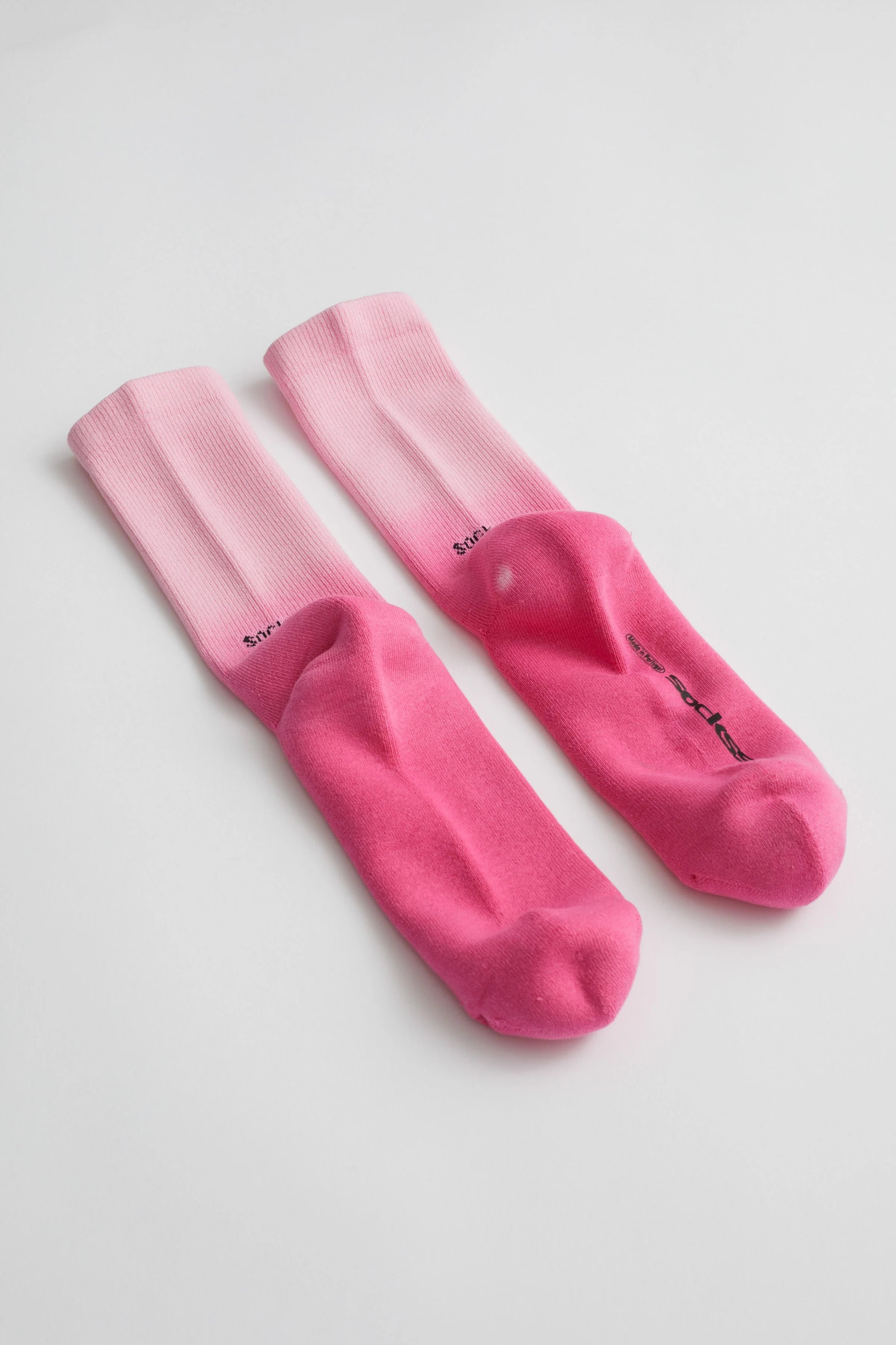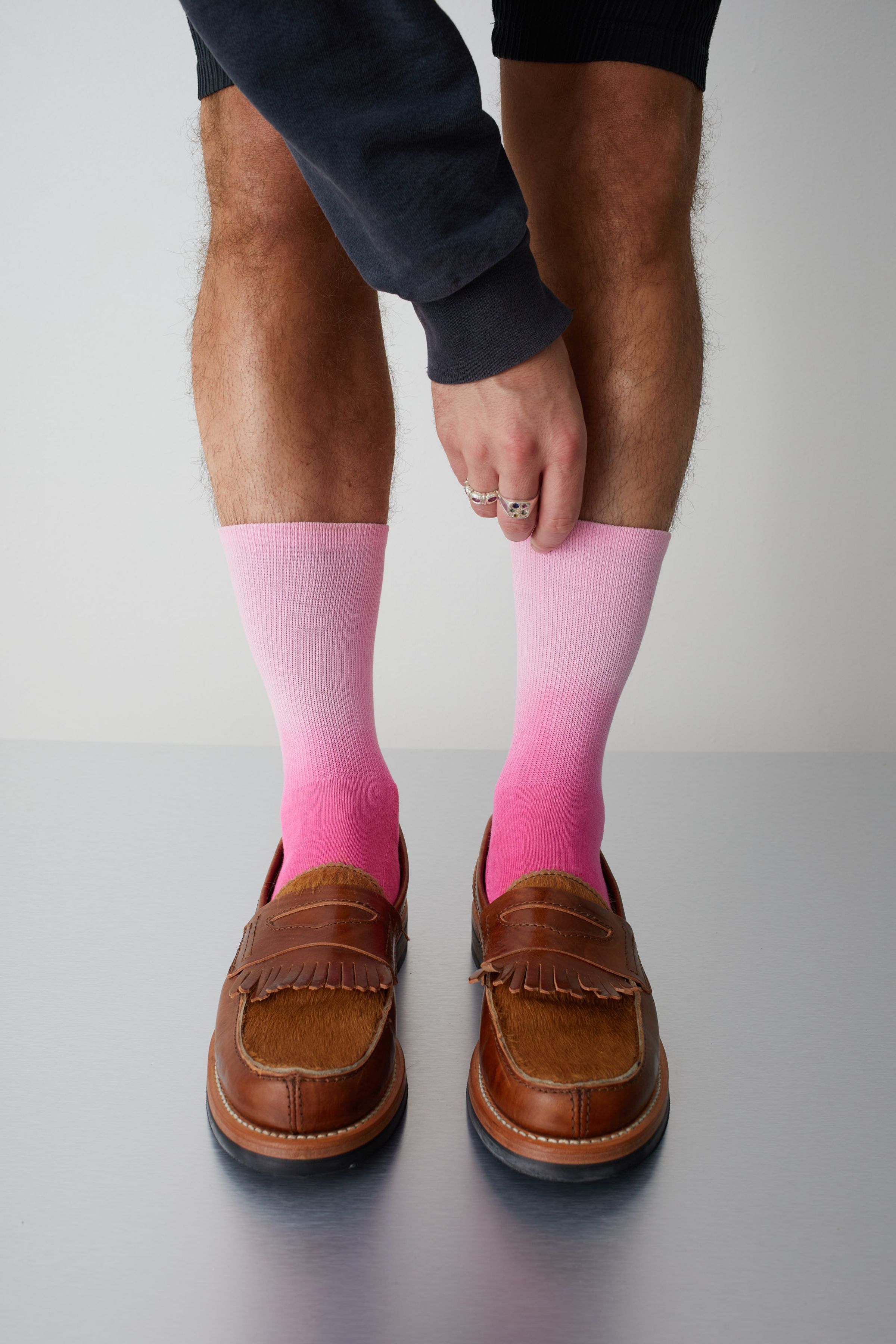 Hand-dyed in Portugal to mimic sky gradients. Original model is made in Portugal with OEKO-TEX® Organic Cotton. Based on a tennis sock with medical grade compression. Available in medium length, cushioned sole, and breathable design. Unisex style.