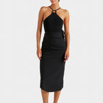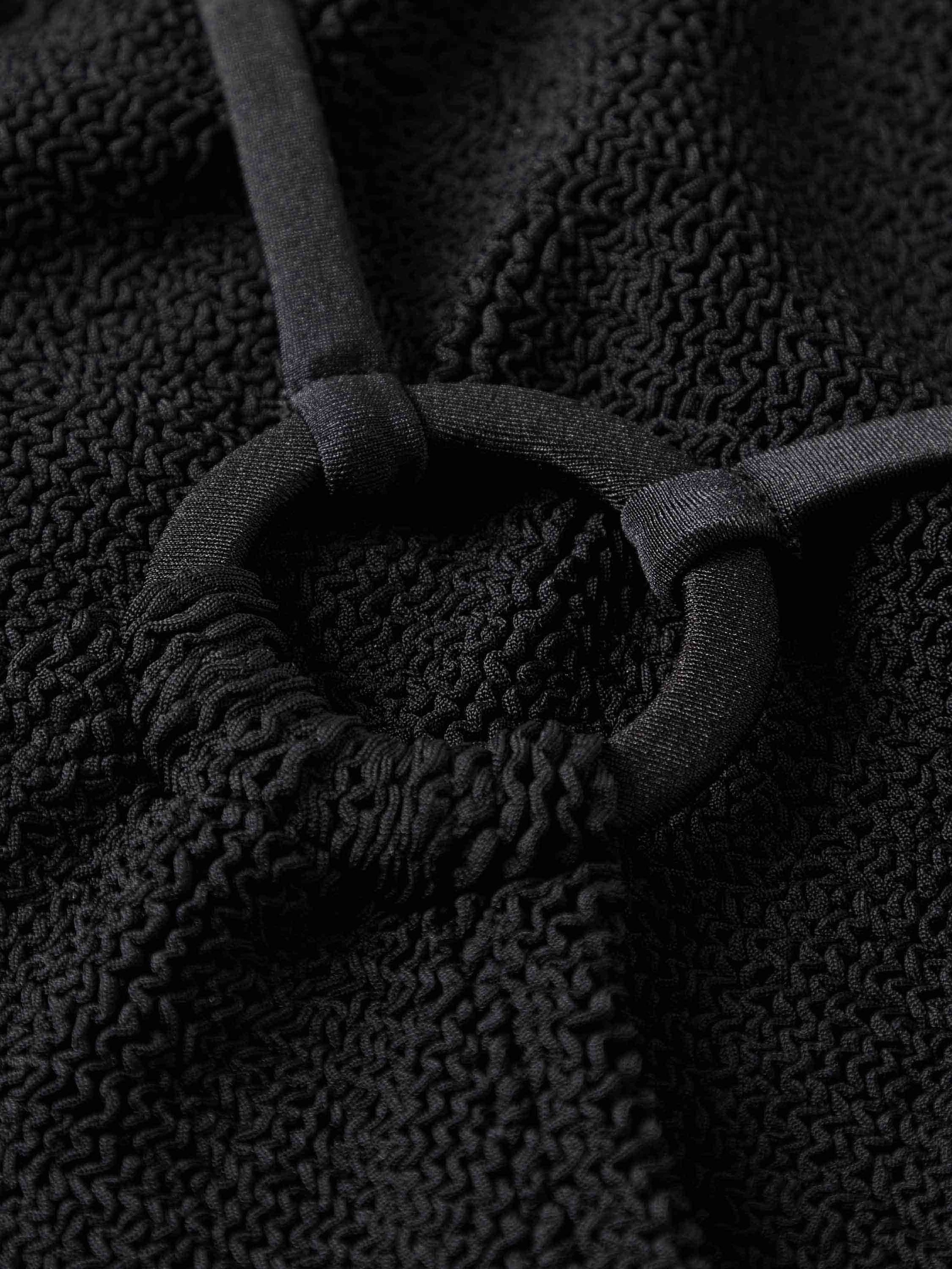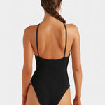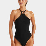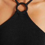 An elegant halterneck swimsuit featuring thin straps and a tonal ring detail designed to elongate the figure. Finished with classic coverage for a refined, sophisticated look.