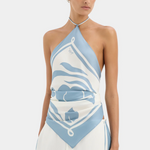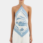 The Lilou Drawstring Pant in Liora Blue is crafted from lightweight silk in an exclusive SIR. print. Designed to sit mid-rise, it features a wide leg silhouette, elastic waistband and drawstring for an adjustable fit.