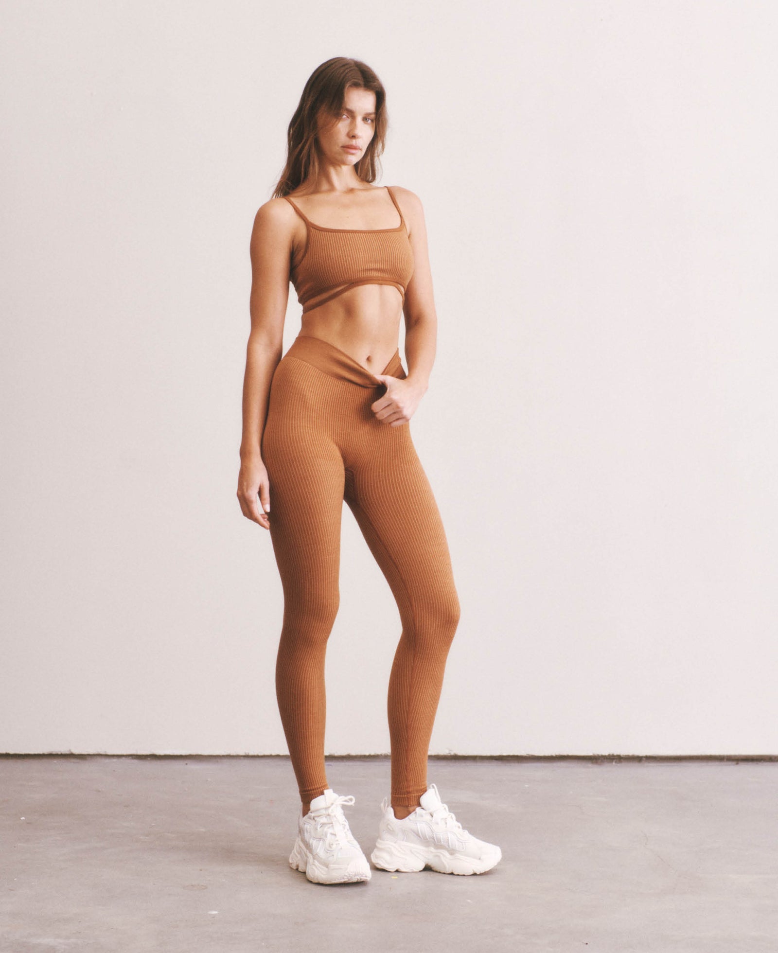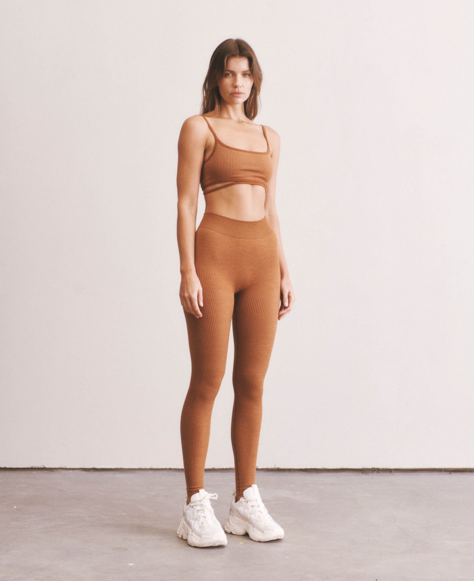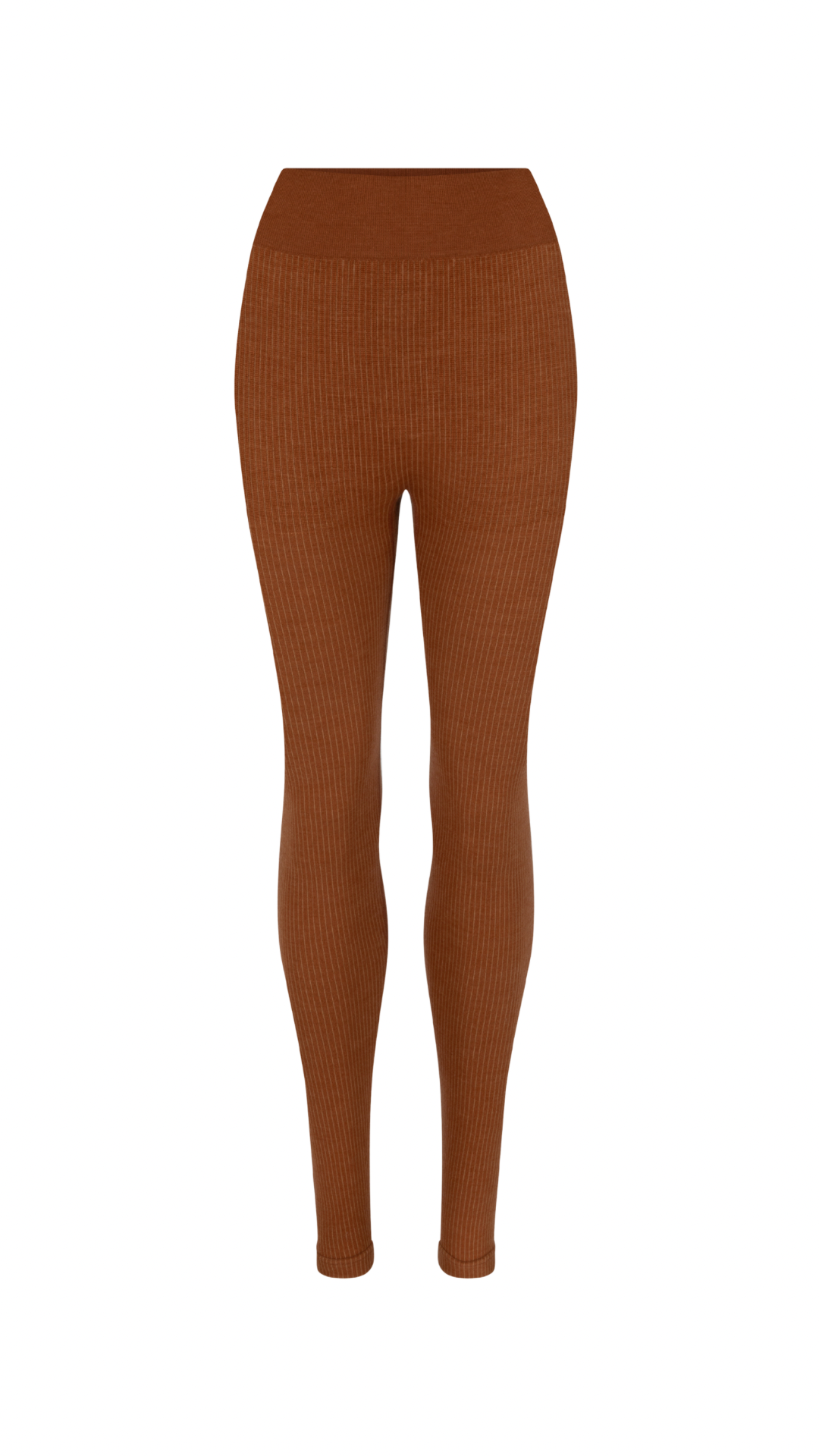 These full-length leggings are crafted from superfine Merino wool with a seamless knit design and a mid to high waist. They offer gentle compression and support while remaining breathable and soft, feeling like a second skin. The two-tone ribbed fabric includes a double-layer waistband with a contrasting color and the Nagnata logo on the back.
