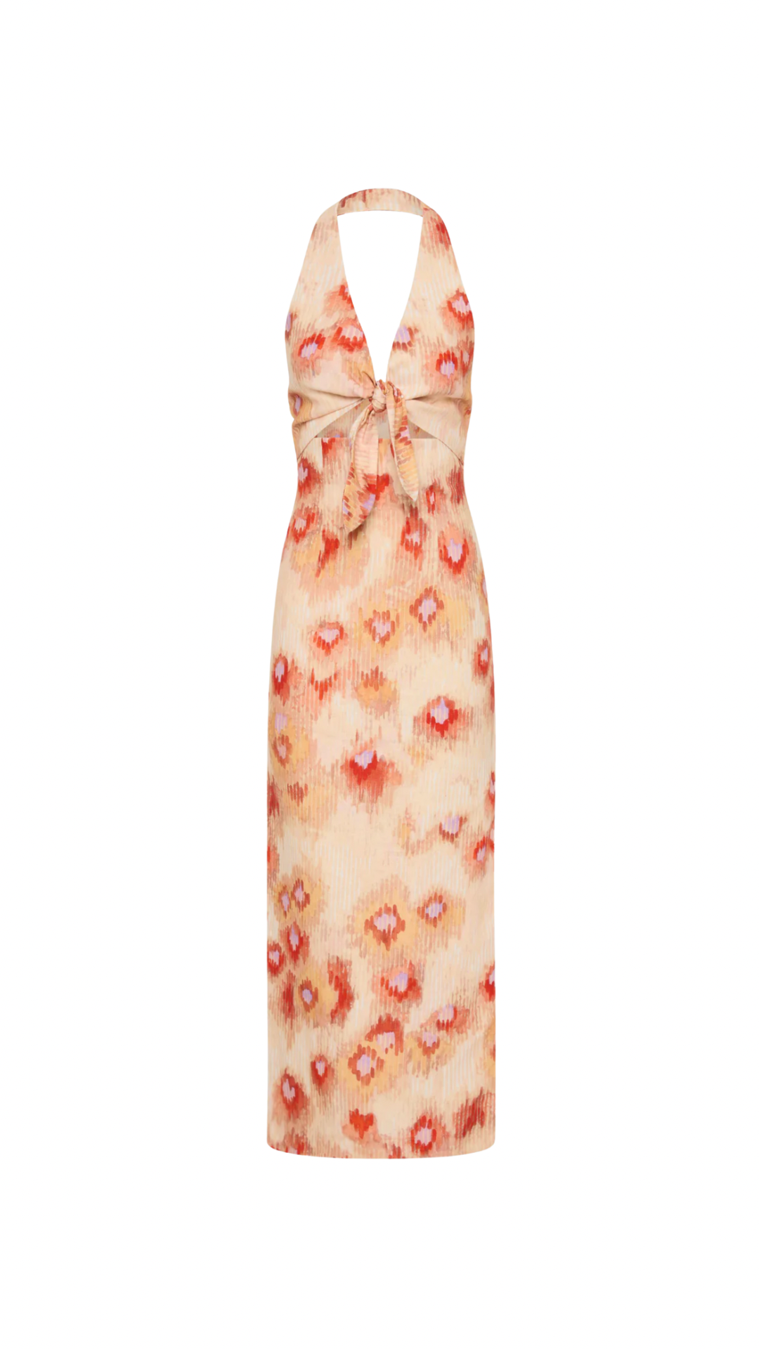 The Fiorella Tie Midi Dress in Petalo Lumina is made from SIR's midweight linen and features a feminine silhouette with watercolor inspired florals. It has a halter neckline with wide front ties, an open back, and a side split for comfort.