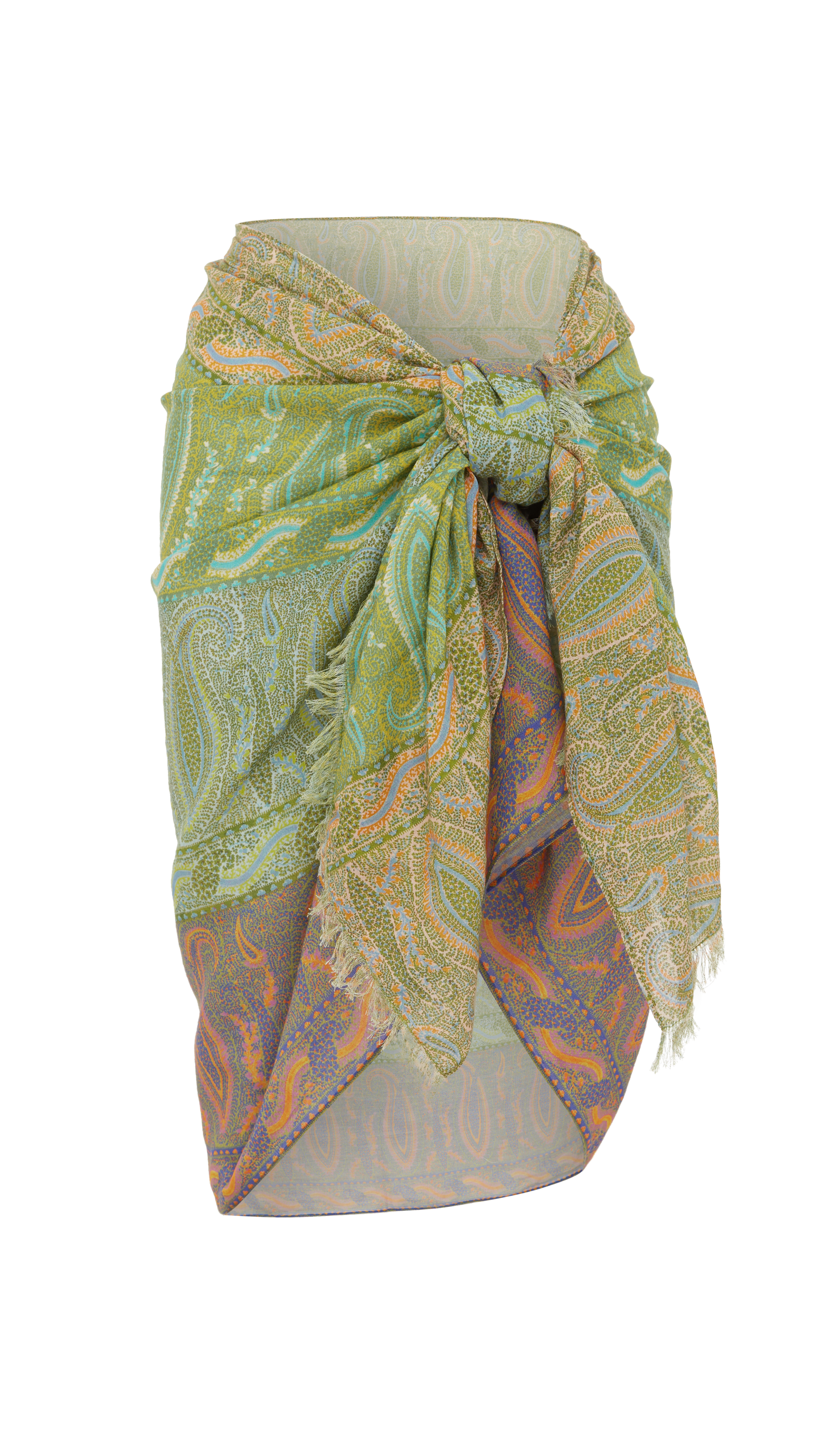 The Lucent Pareo captures effortless elegance with its flowing silhouette and intricate design. Ornate paisleys and a faded chintz rose pattern glow softly across lightweight voile fabric, harmonizing in soothing shades of azure, ochre, and olive. This versatile garment features a striking border print that adds sophistication to any look. Wear it tied as shown for a classic sarong style or fold it in half to create a chic mini length, perfect for beach days or casual outings. Designed for both comfort and flair, the Lucent Pareo is an essential piece that enhances your wardrobe with graceful movement and distinctive style.