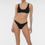 The Lumiere Sporty Set is a metallic two piece bikini with mid coverage bottoms and flattering scoop neck top.
