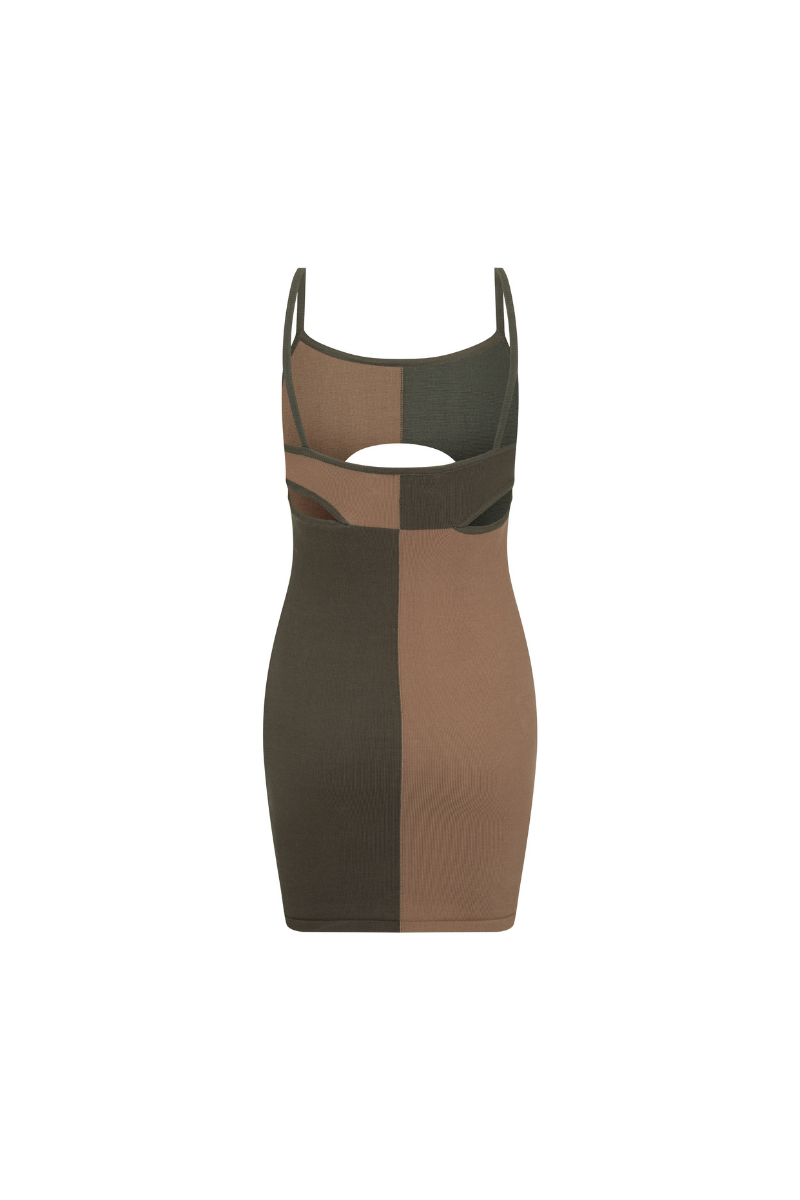 Extra fine organic cotton blend fitted mini dress featuring cut-out underbust detail. A quintessential summer dress in vibrant two-tone colours, this garment is fully engineered to shape, meaning there is minimal yarn wastage during the production process. This style comes in 4 sizes XS, S, M and L.