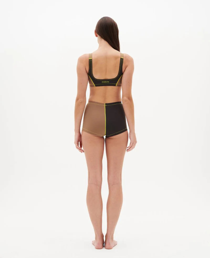 As part of Nagnata’s first Swim Surf Sport capsule, the Sundown Surf Short is a play on Nagnata’s signature colour block styles with contrast colour flatlock seams true to its sports-meet-fashion aesthetic. An improved mid-rise mini fit, the surf short is made from a specialised GRS certified Italian recycled bonded fabric that offers durability and support to take you from studio to surf. All swim surf styles feature new branding with a retro sun-inspired logo, a fresh take on the original Nagnata mandala.