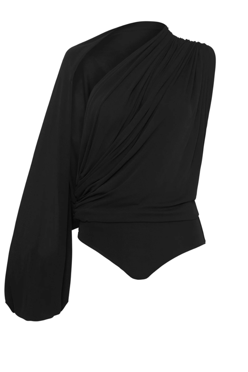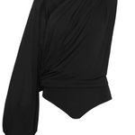 Delicate and luxurious draped jersey bodysuit. Fabric collapses into a form-fitting, high-waisted brief.