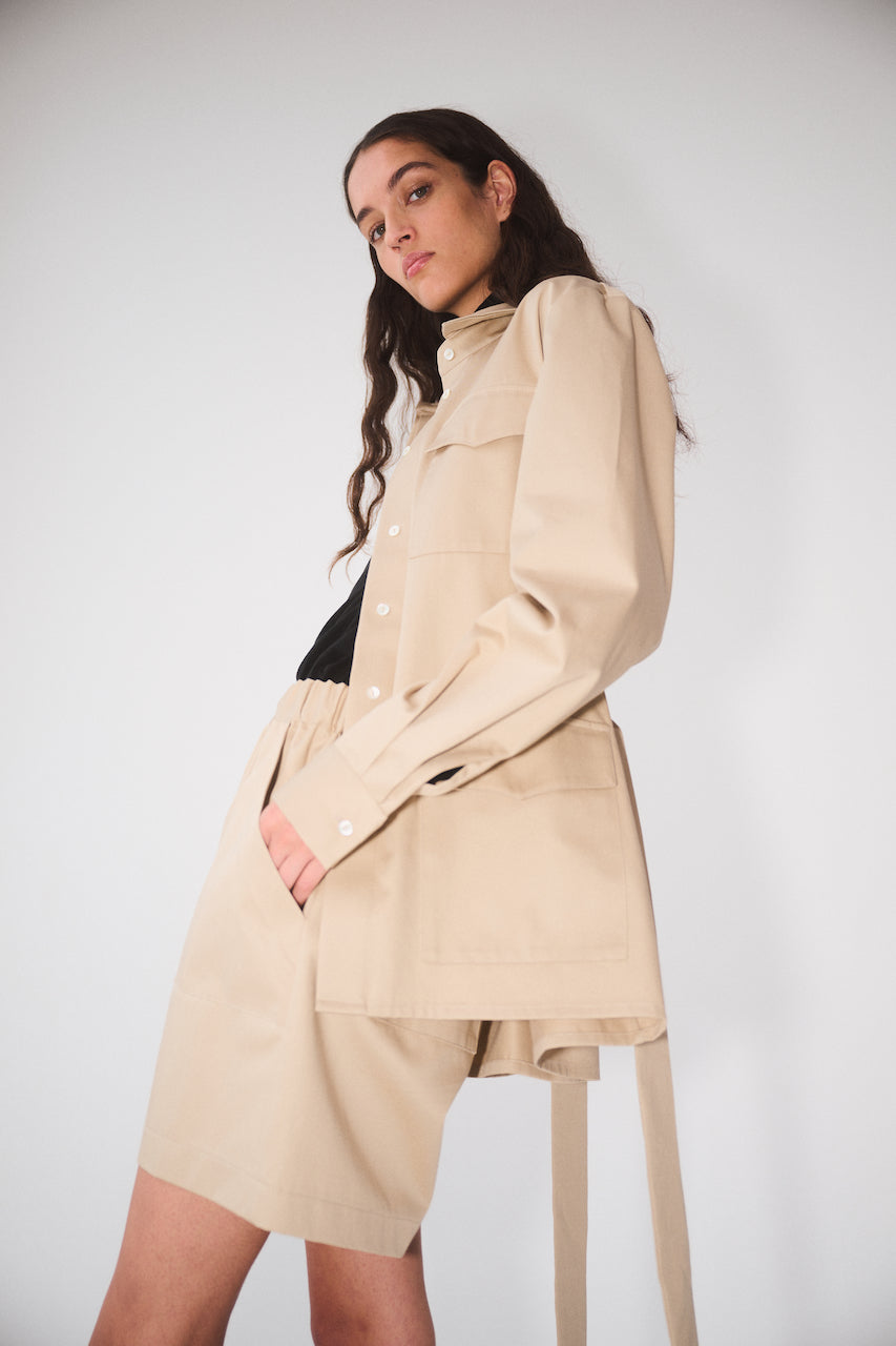 The Boxy Forio Jacket with Tie in Beige by MATIN offers a twist on the classic oversized shirt. Complete the effortlessly stylish matching separates look with the Matin Elastic Top Short in beige.