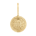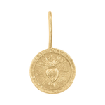 This gold coin pendant showcases a detailed sacred heart at its center, surrounded by radiant rays that embody faith and sacrifice. On the reverse side, a fiery sun symbolizes the strength and indestructibility of love, making it a meaningful accessory. Crafted with 18K gold plating, the pendant measures 1.5cm by 1.5cm, offering a subtle yet elegant touch to your outfit. Perfect for everyday wear, it serves as a reminder of enduring love and devotion.