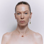 The Urraca by Cleopatra's Blingcare half-hoop earrings with a stud fastener, adorned with a jade gem, and looped golden chain.