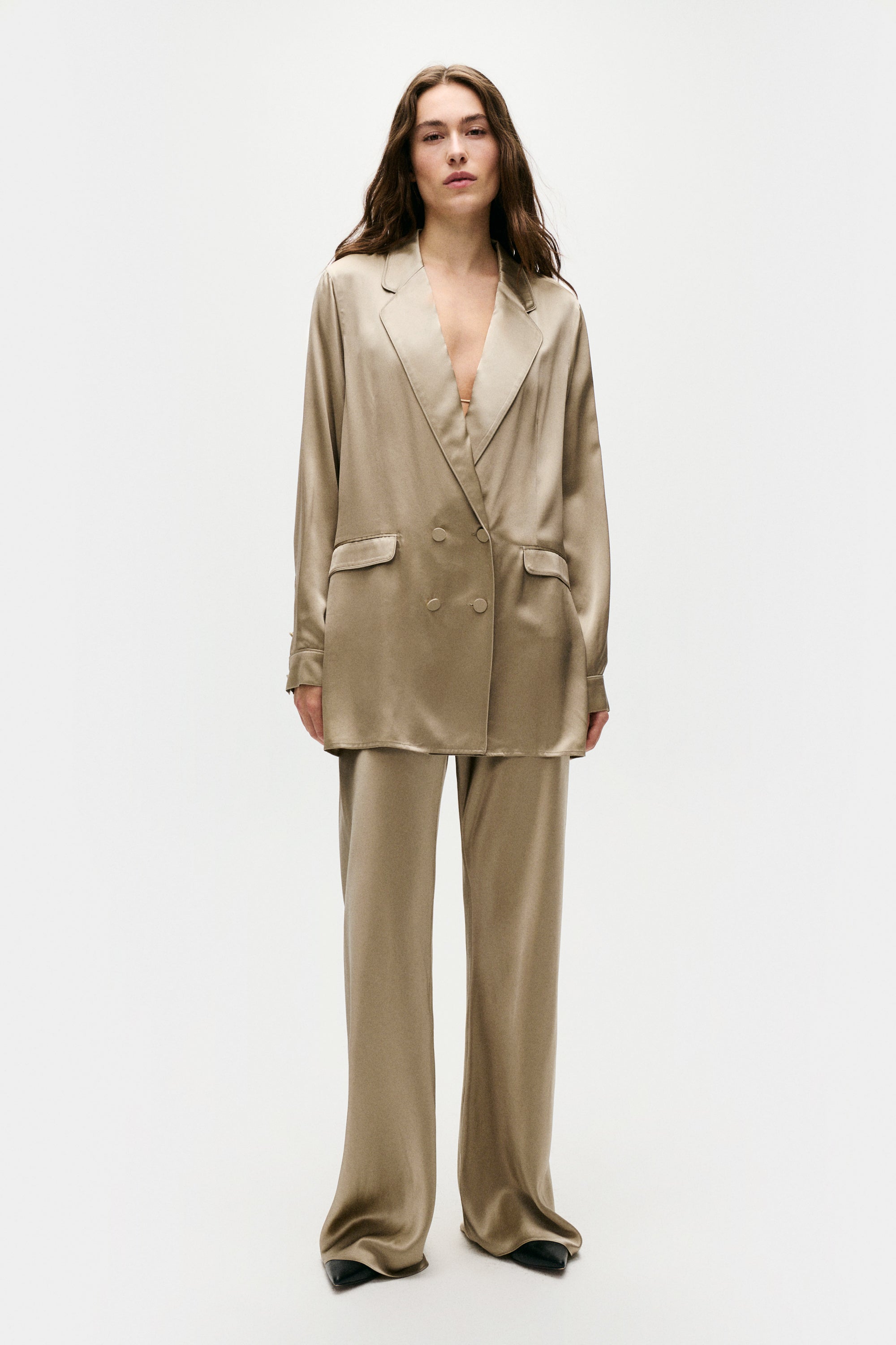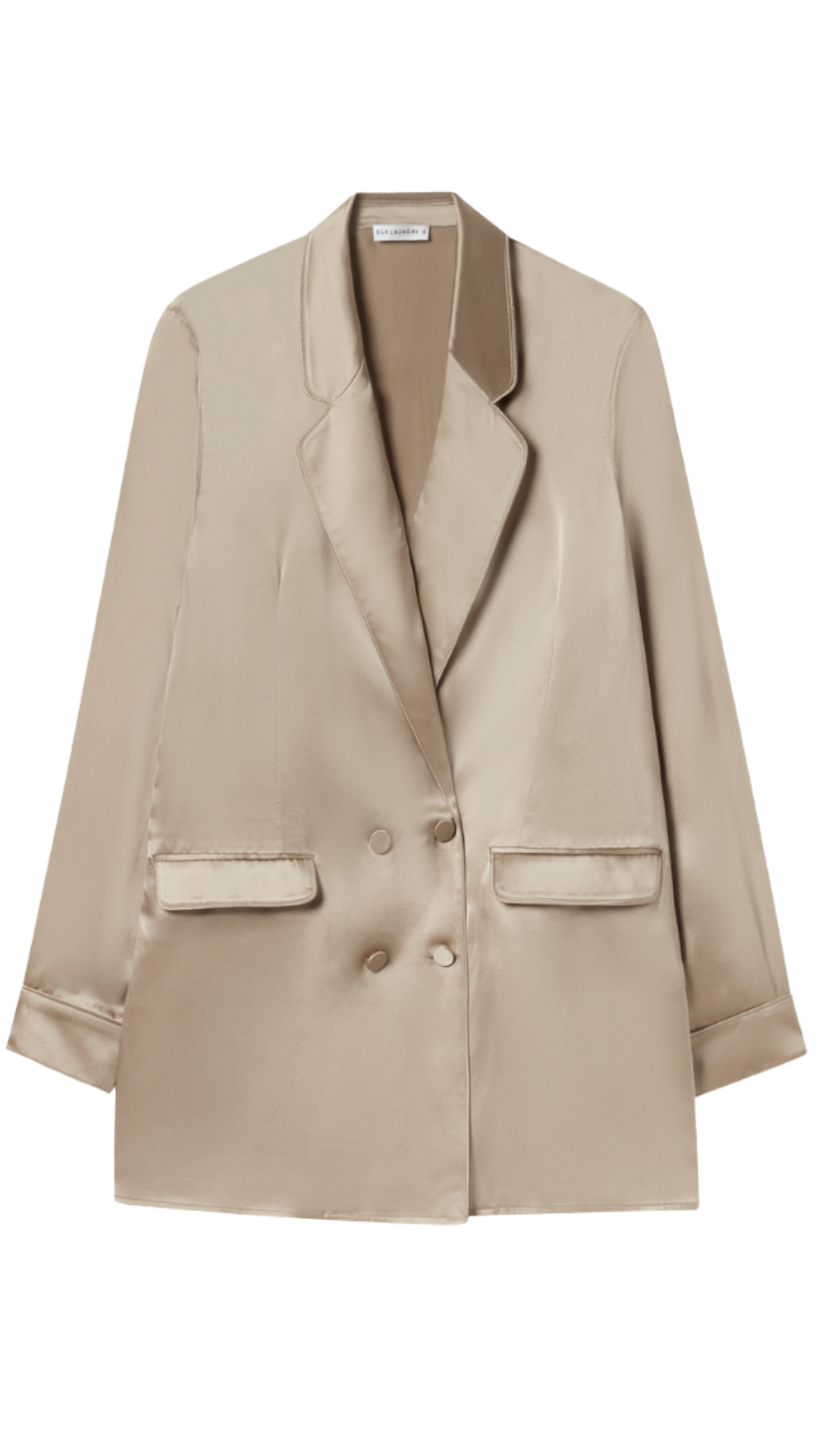 The Relaxed Blazer by Silk Laundry is cut with a loose silhouette and left unlined, the Relaxed Blazer defines soft suiting. A deep collar, silk-covered double-breasted button closure, and flap pockets reference classic menswear. Fluid silk drapes to create a distinctly elegant, feminine shape. Pair it back perfectly with our Bias Cut Pant to offer the best in refined elegance for an occasion to match.