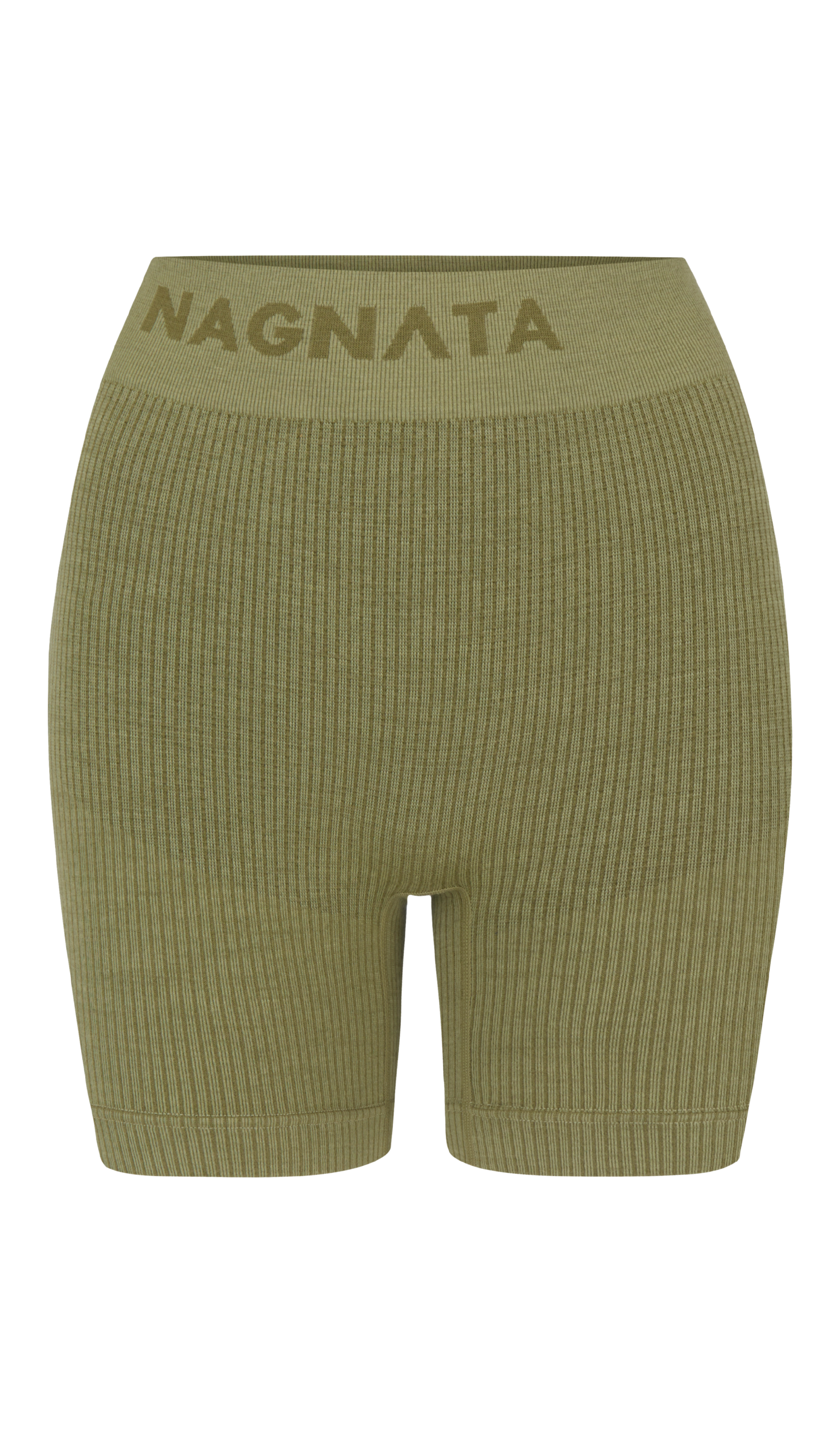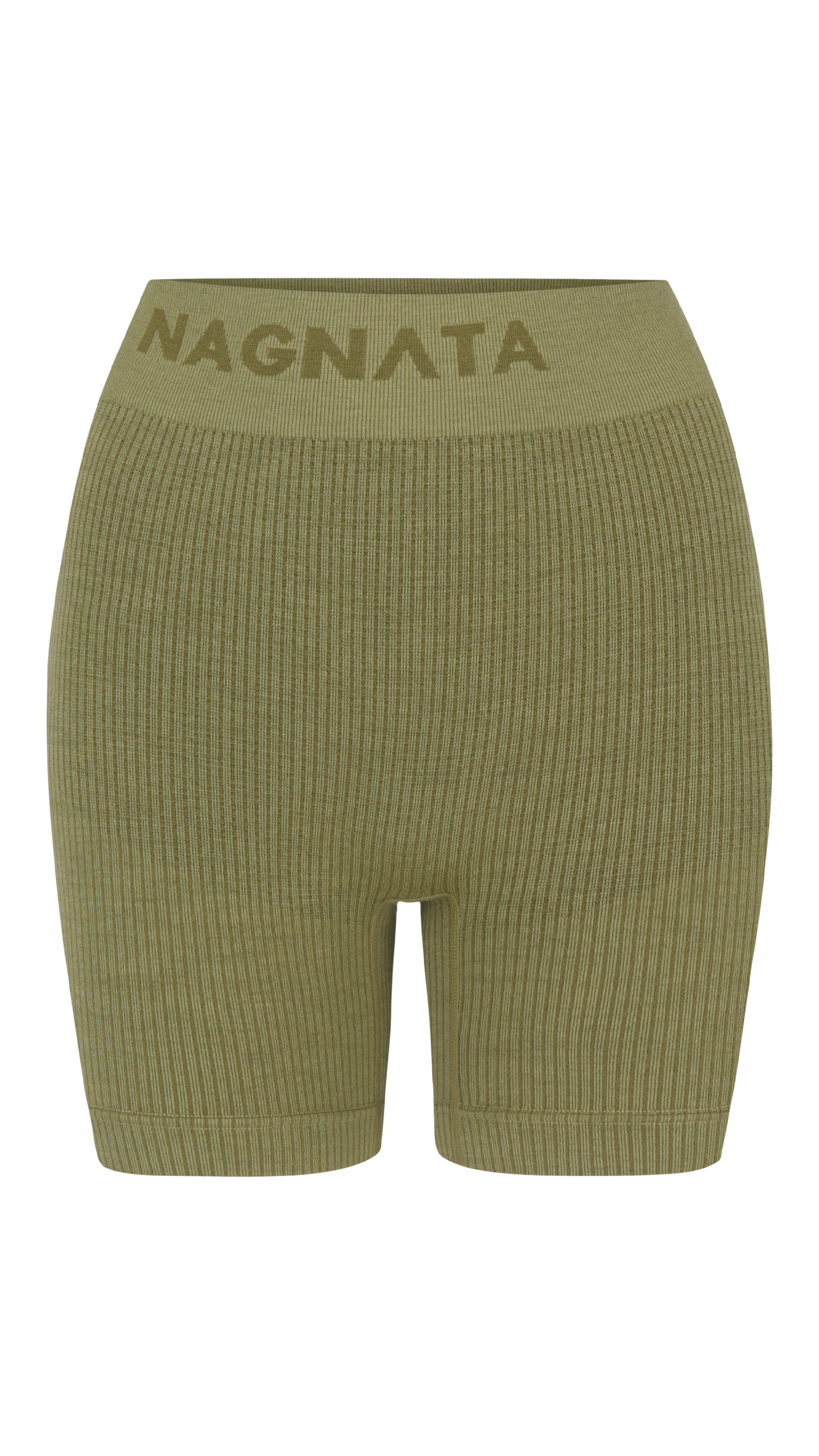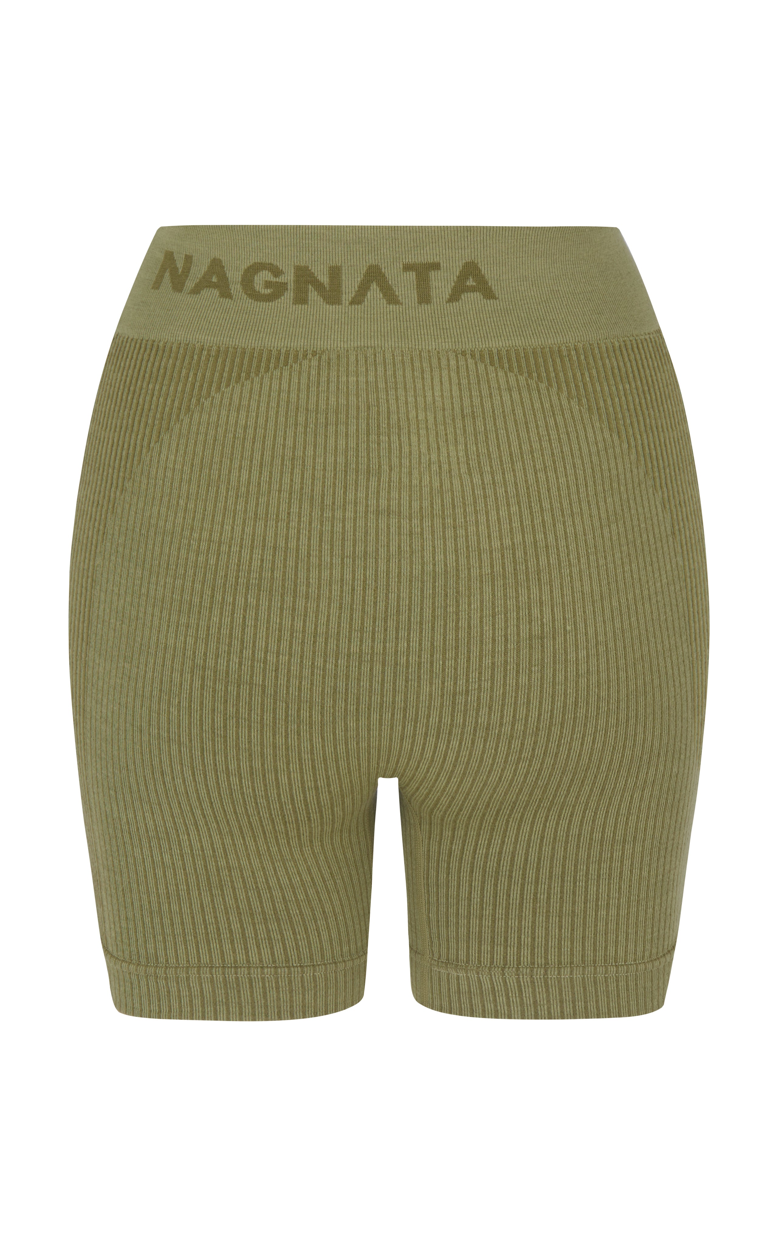 Superfine high-waisted Merino wool seamless knit rib mini short made in Nagnata's signature seamless fabrication offering mild compression for support and breathability. The style features a double layer waistband with jacquard Nagnata logo on front and back waistband. Crafted in Nagnata's signature Nagnata rib, these shorts include contrast jacquard stripe placement artwork.