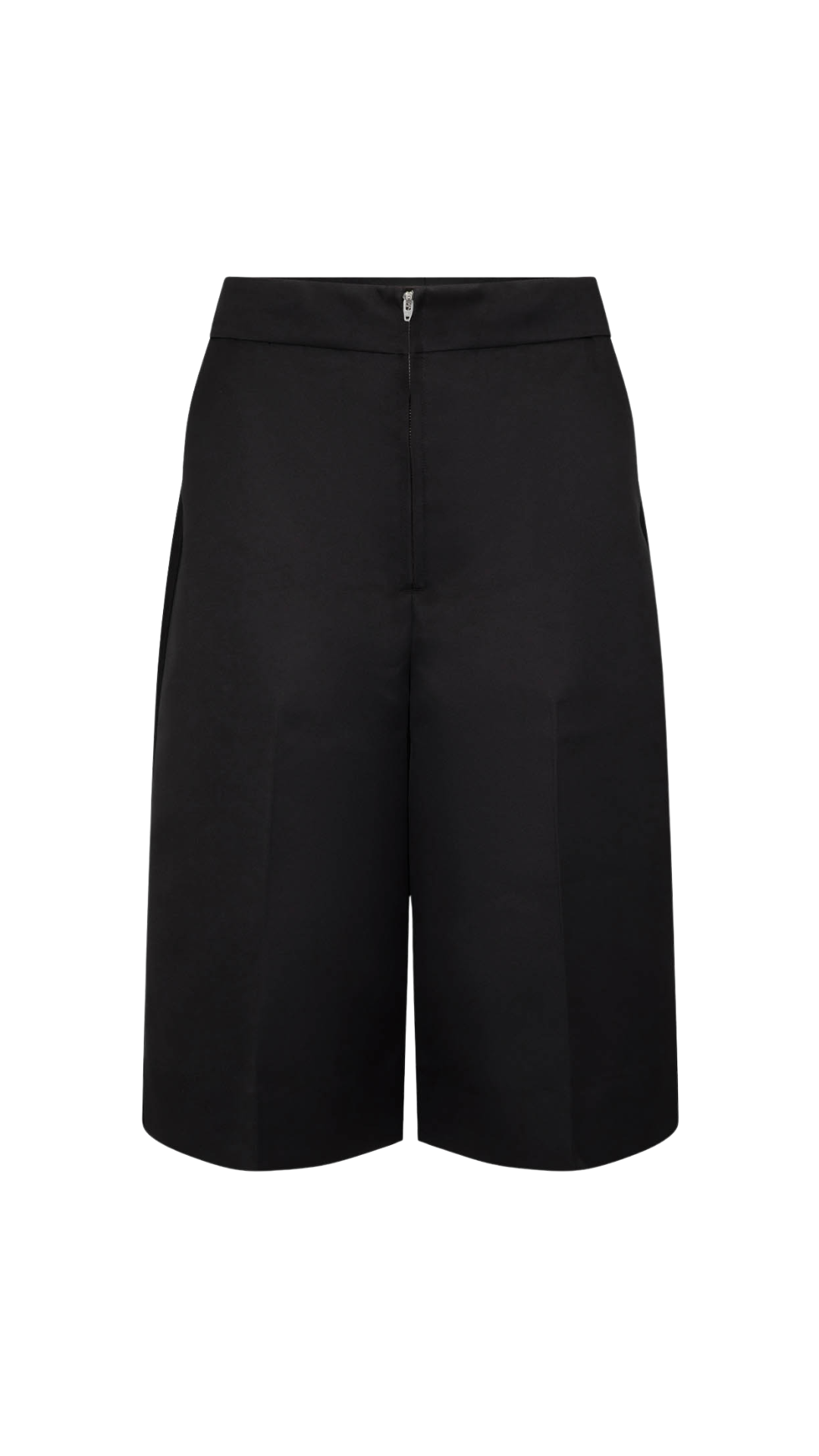 Tailored shorts cut in black satin with an exposed front zip detail. Cut with a structured waistband and a wide-leg silhouette. Intended to sit on hips, however the elongated rise allows flexibility. Falls just below the knee.