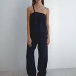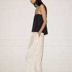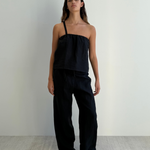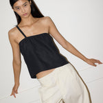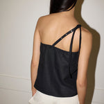 This Button Strap Top by Deiji Studios in Black features a straight-cut, strapless design with an elasticated neckline and an asymmetric press-stud strap. It has a relaxed fit and is made from 100% GOTS organic, OEKO-TEX 100, and EU certified stone-washed French linen.