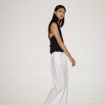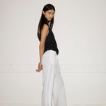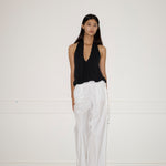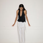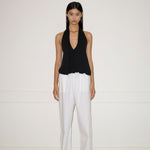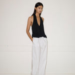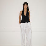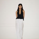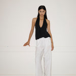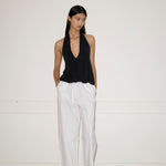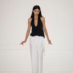 Relaxed halter top features flattering v neckline, soft wrap over with elasticated bubble-hem, low back in a relaxed silhouette.