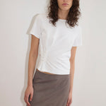 The Pinch Tee from Deiji Studios in white is a laid-back short sleeve top showcasing a timeless crew neckline, complemented by loose elastic and a straight-cut design. It features a distinctive pinched side seam adorned with hook and eye closures, enabling the silhouette to be styled either cinched or open, crafted from 100% Organic Cotton GOTS.