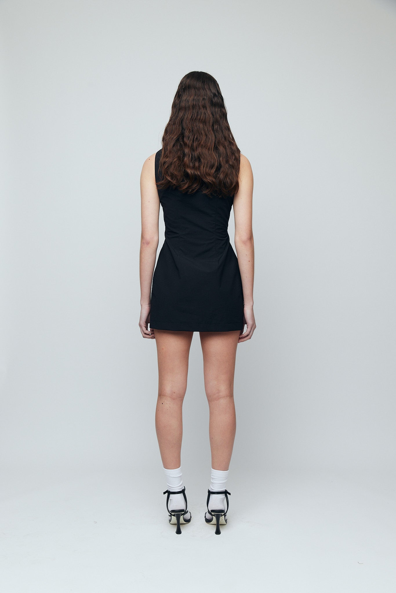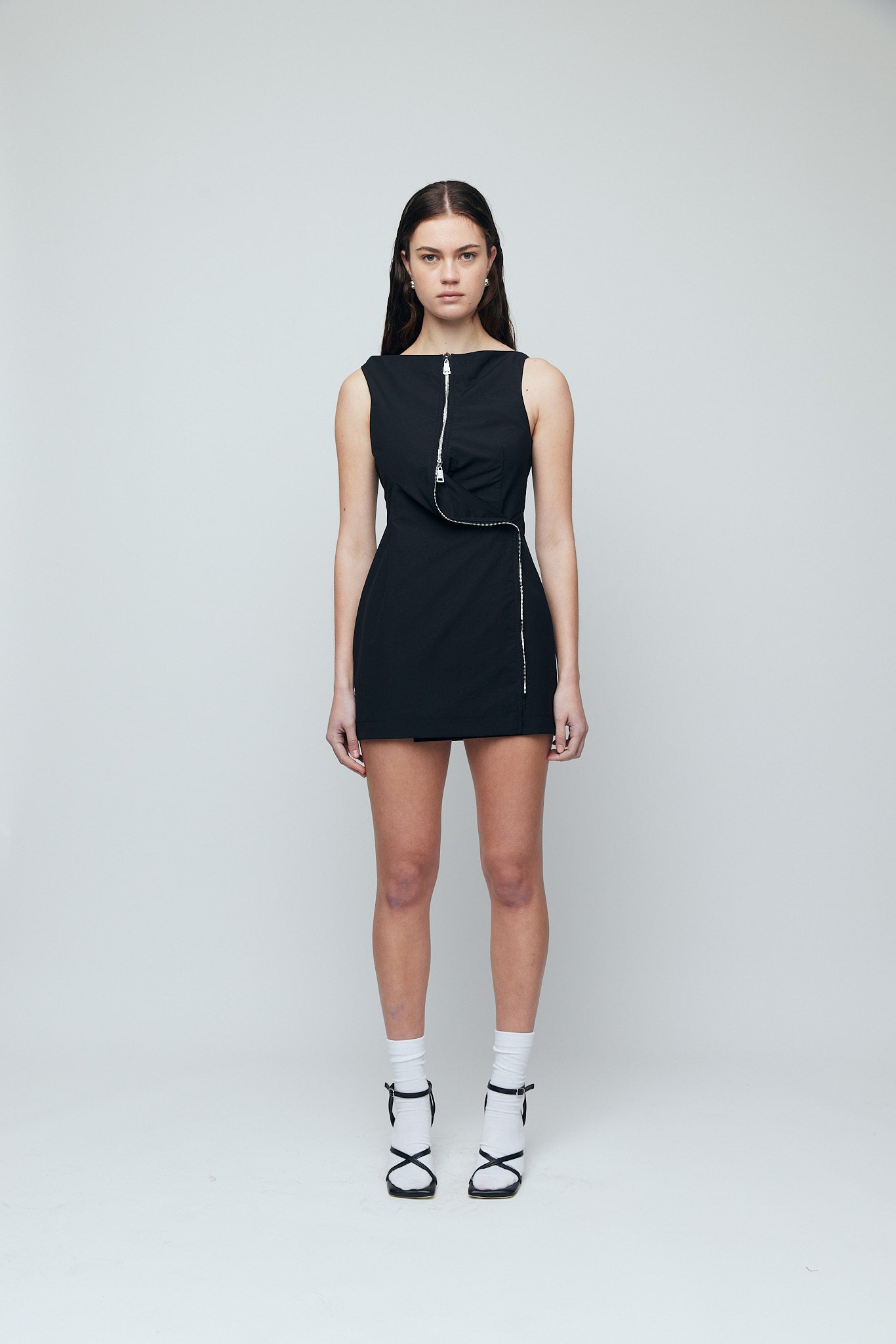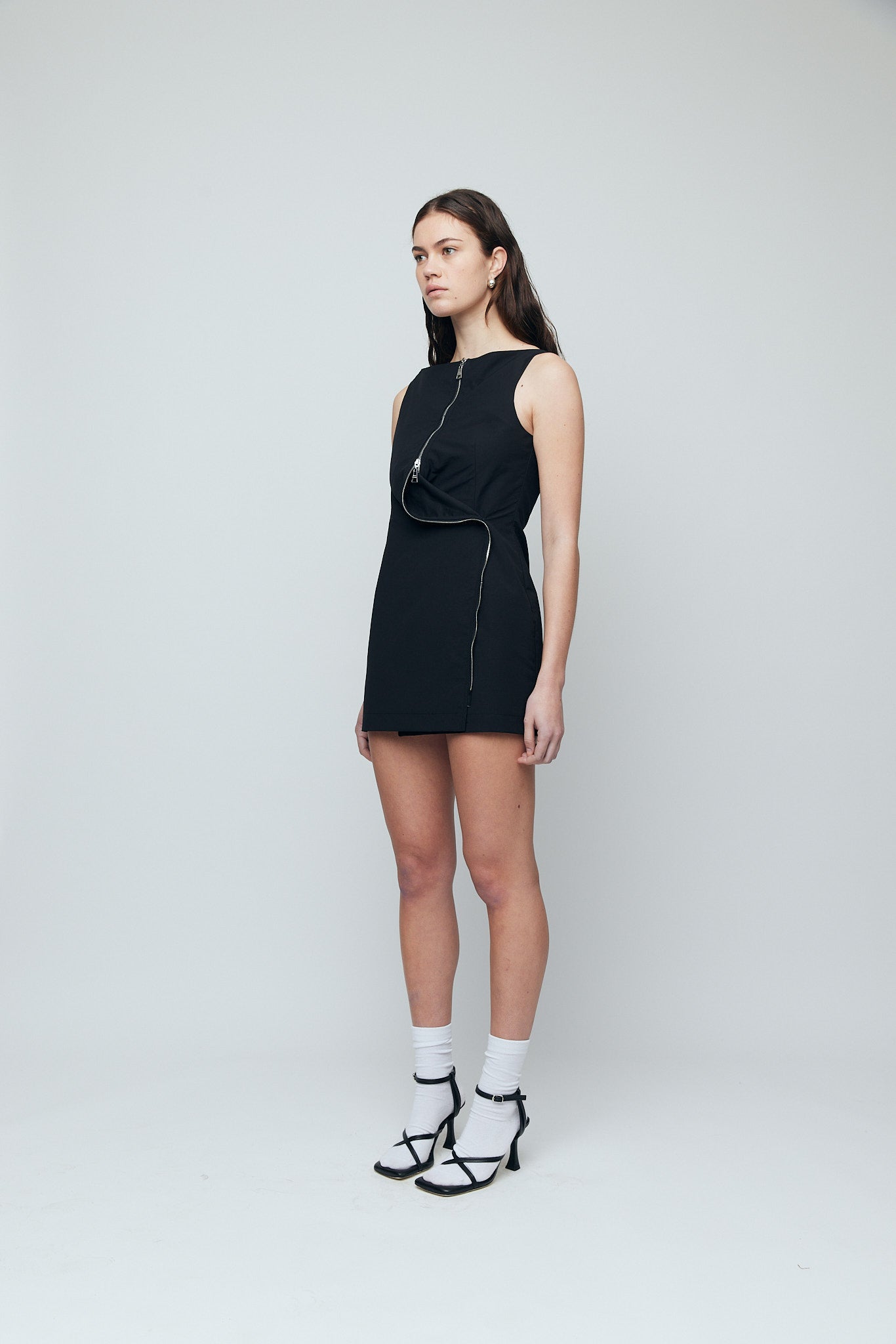 Lucie Zipper Mini Dress by Wynn Hamlyn in Black. 62% cotton, 38% Nylon. Straight neckline, sleeveless on the arms and zip detail at front.