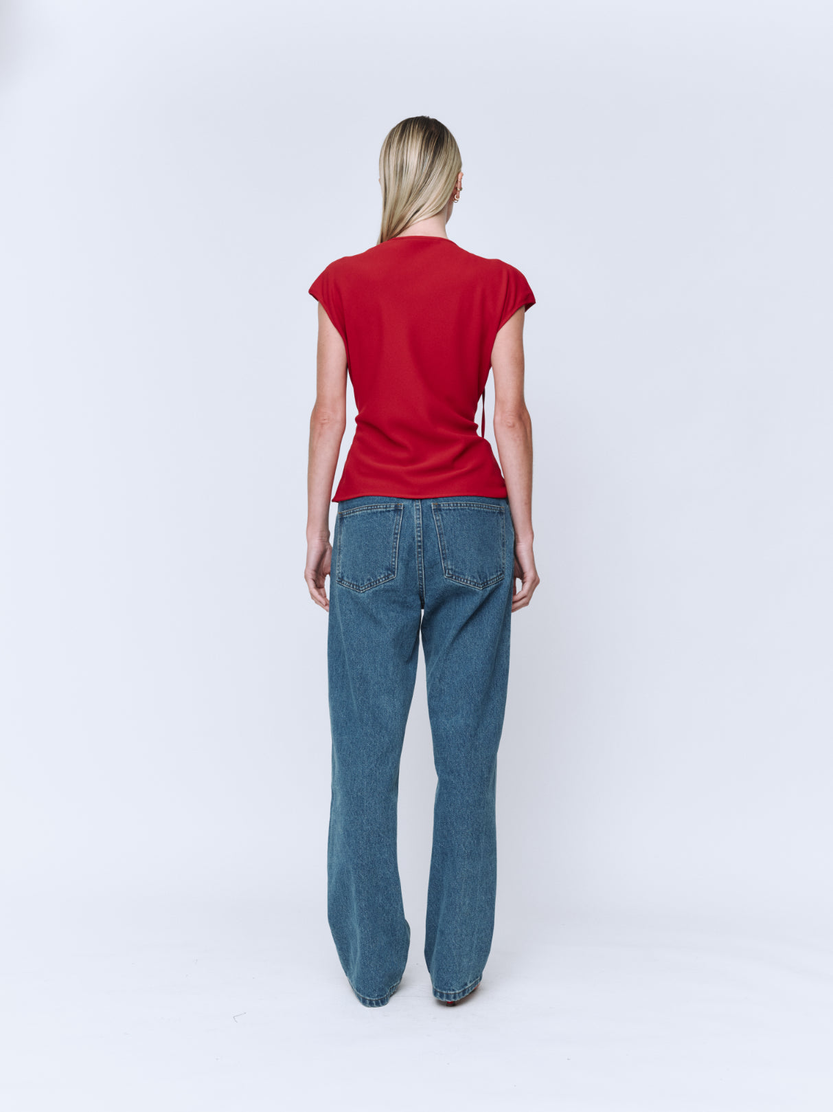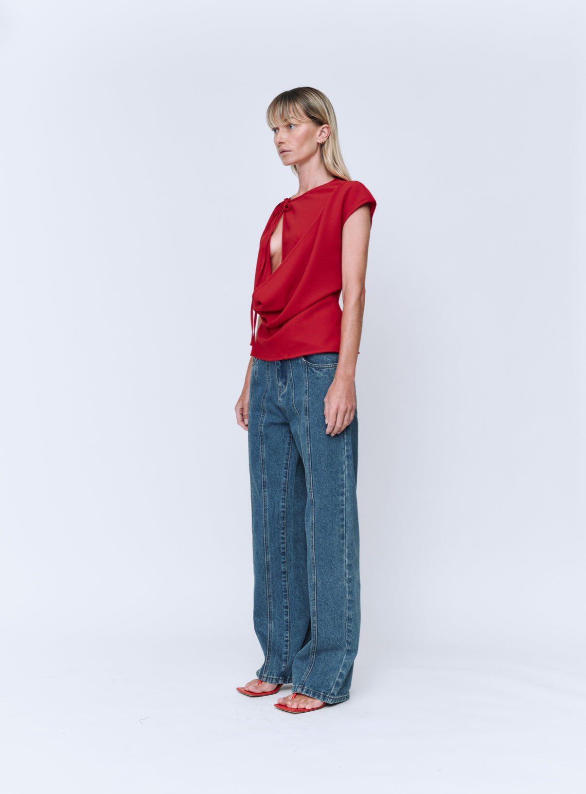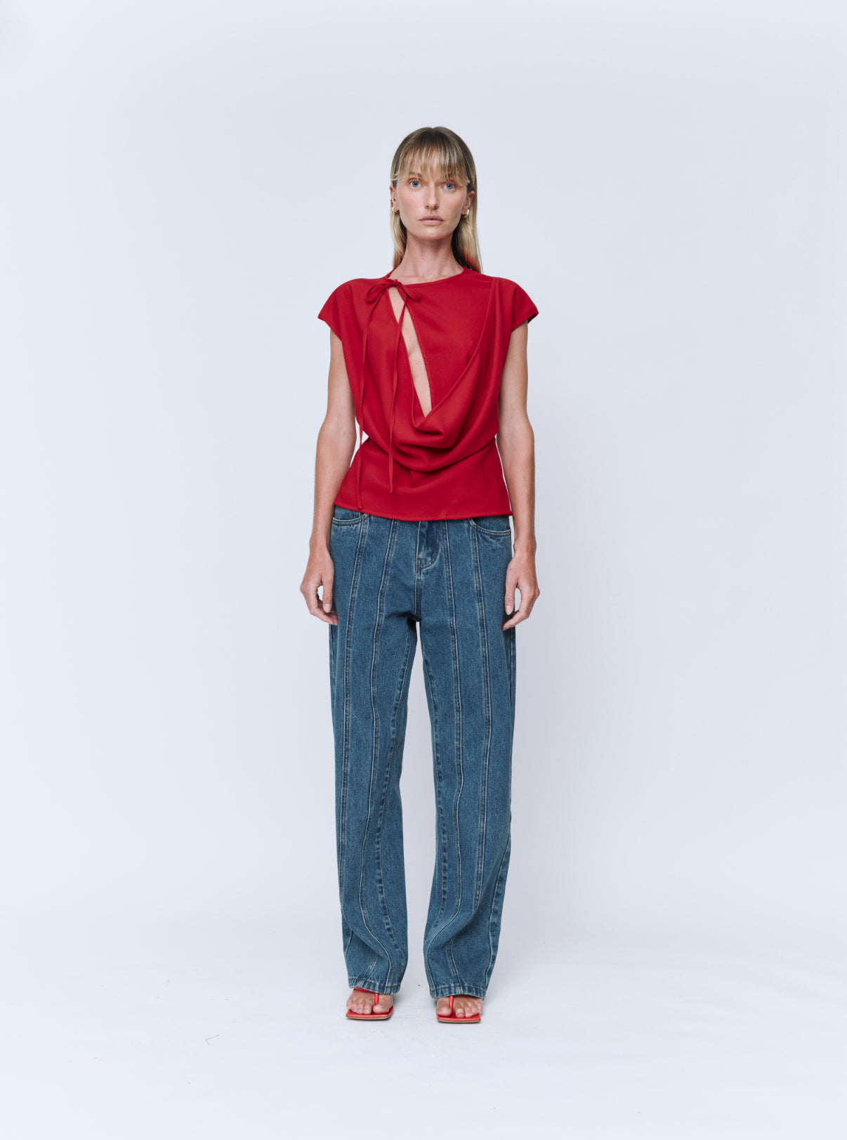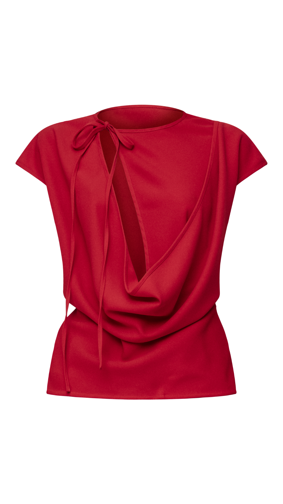 This Maeve Top in red features a fitted cut with capped sleeves and a cowl neckline. Made from a soft, lightweight silk-like fabric, it includes a tie closure at the neck for a secure fit.