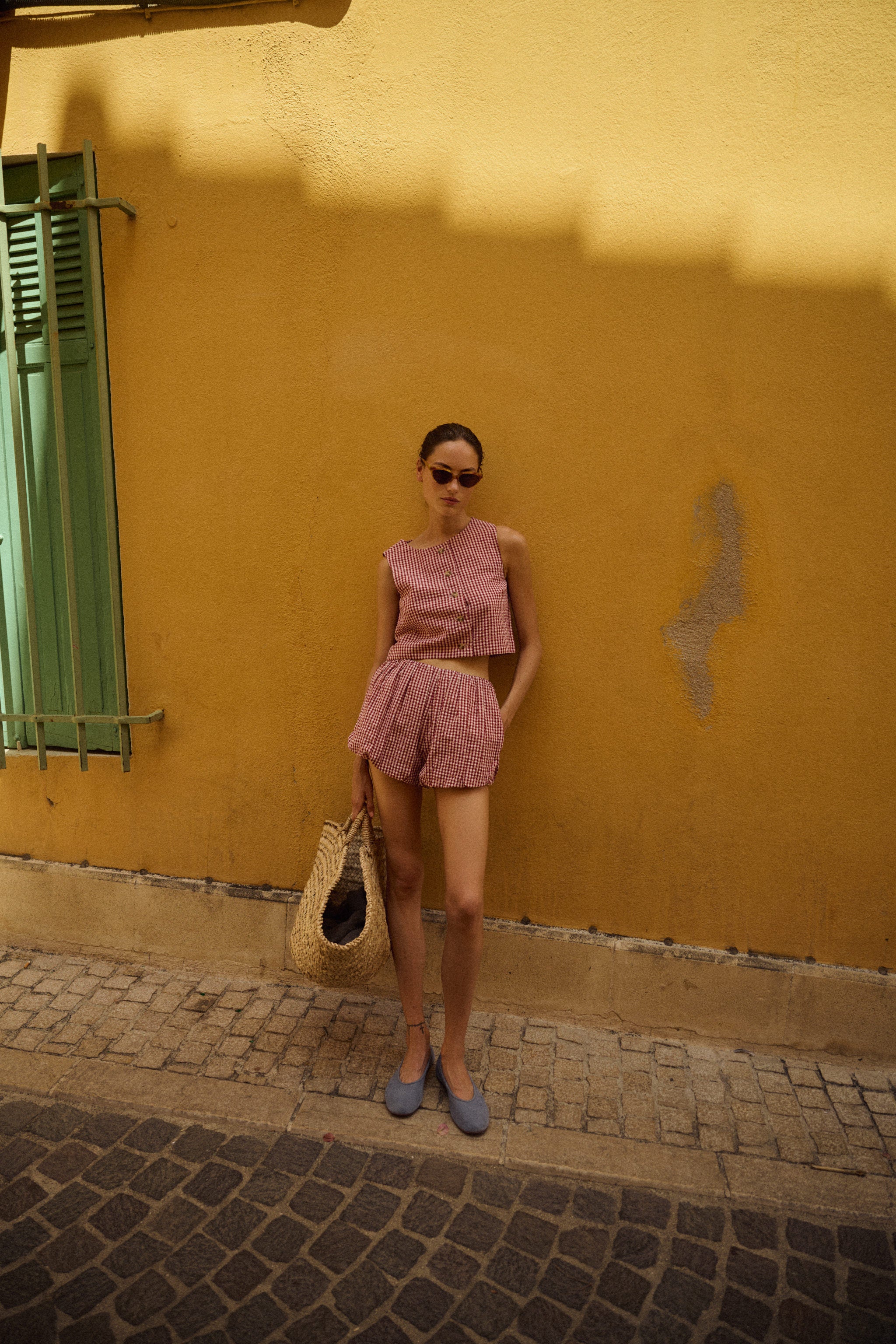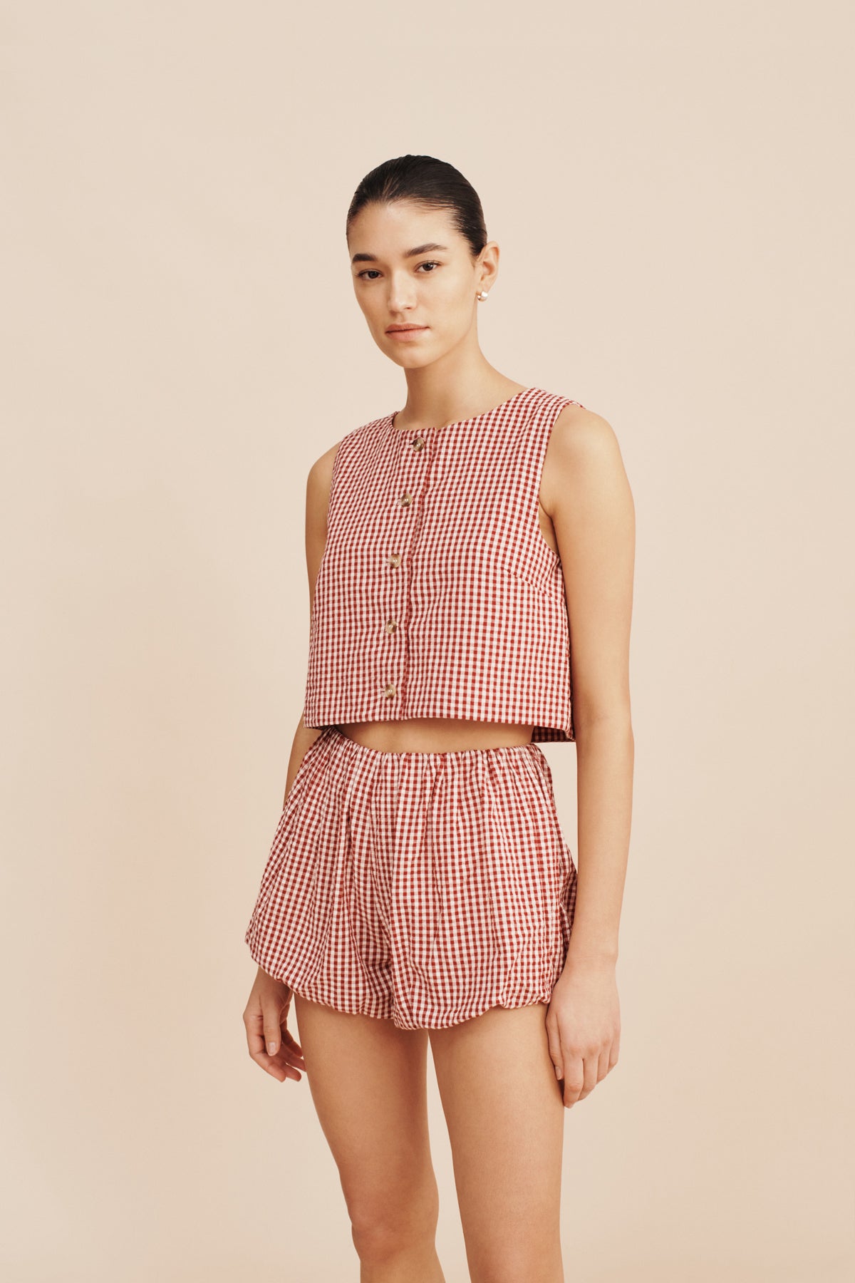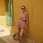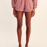 The Aurelia Shorts are made of soft, lightweight cotton and feature a flattering high-rise waist and a billowy hem. They have a nostalgic red and cream gingham pattern and can be styled with the matching Rio Top.
