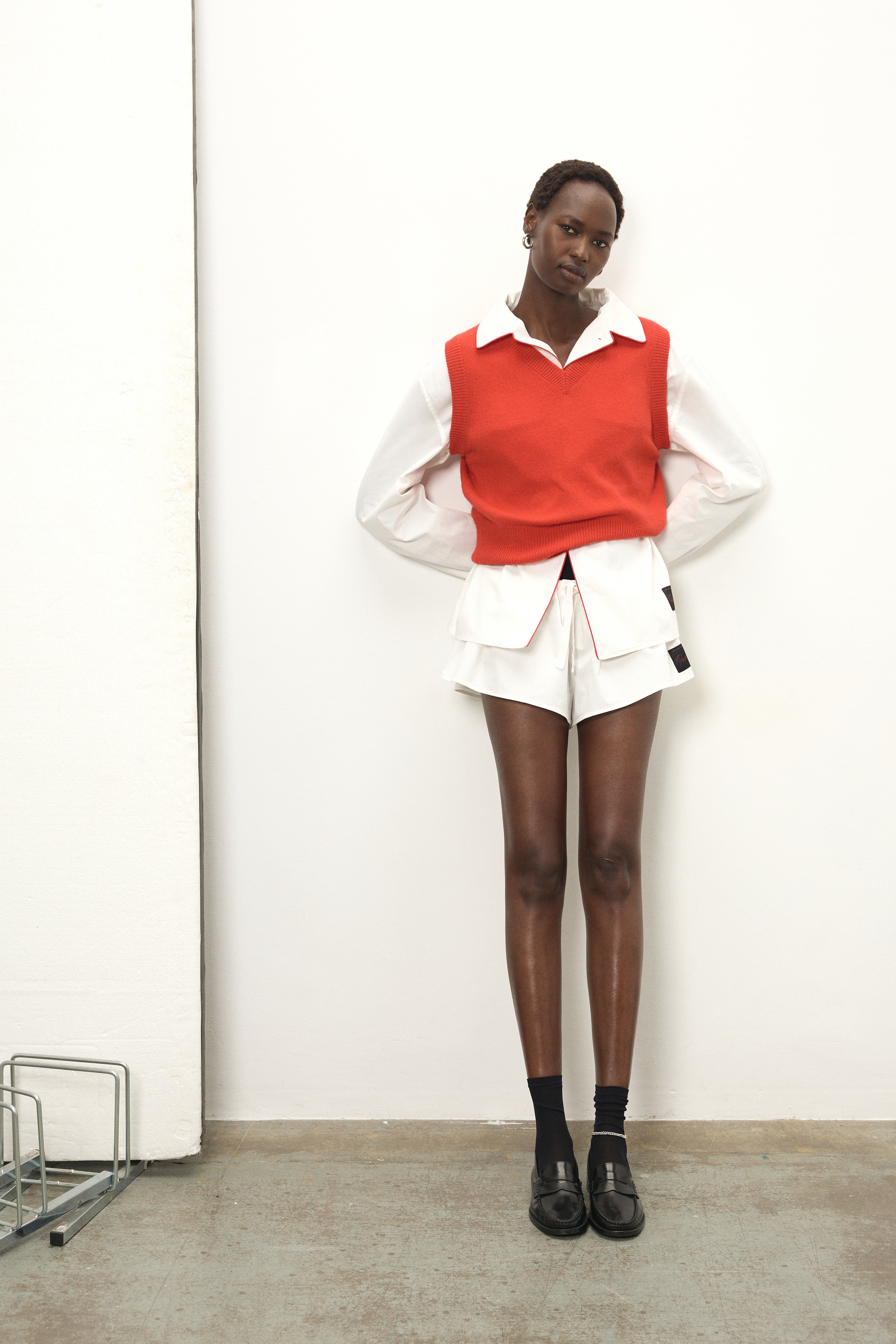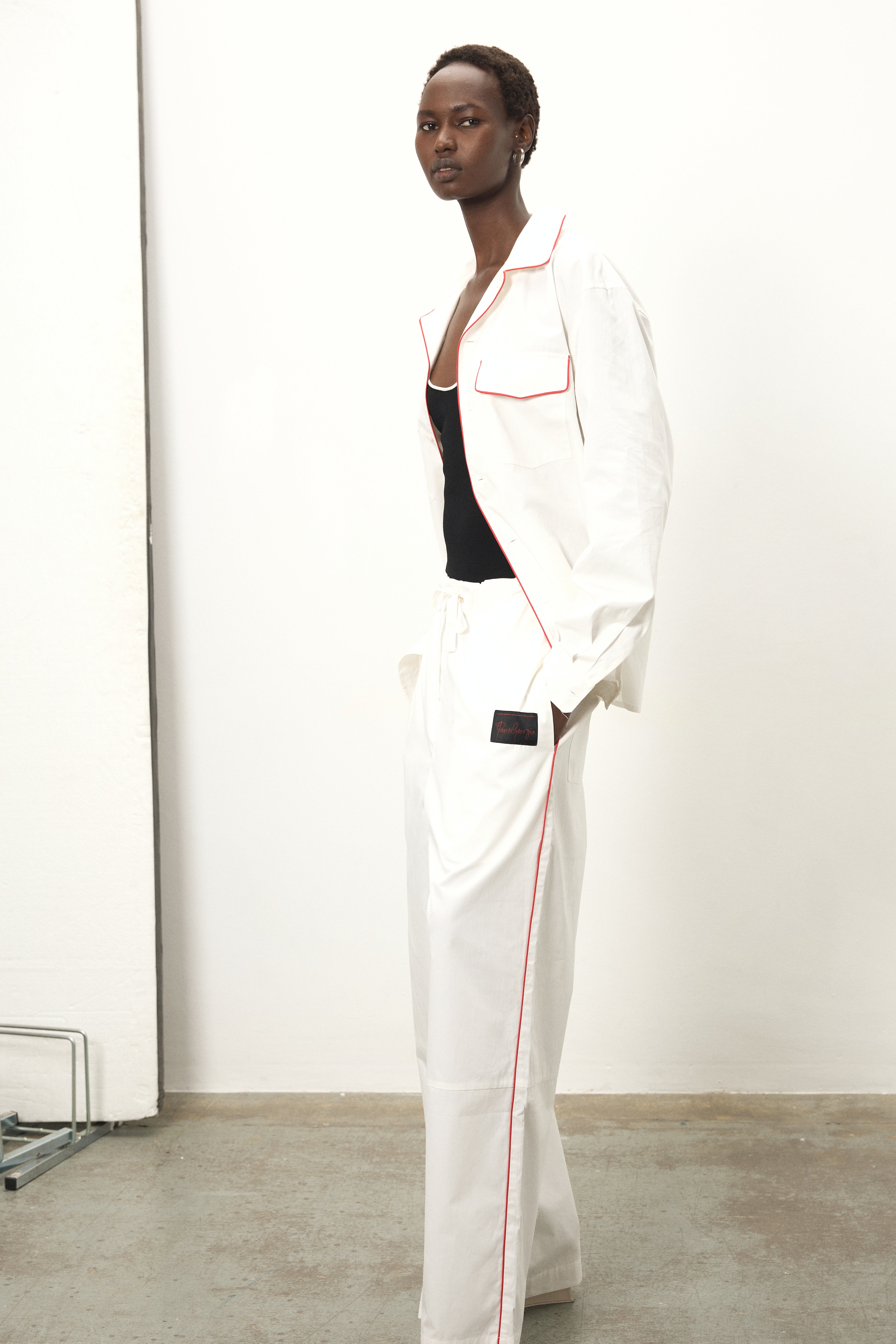 A crisp cotton poplin essential with design precision. The Boxy Poplin Shirt defines modern minimalism through its structured silhouette and thoughtful detailing, contrast red piping traces the collar, front placket, and pocket edges, anchored by the signature Paris Georgia label. Clean lines, elevated everyday wear.