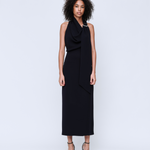 The Catherine Buckle Maxi Dress is a halter maxi dress with draping across the chest and a custom silver buckle detail. A sculptural silhouette with a considered edge.