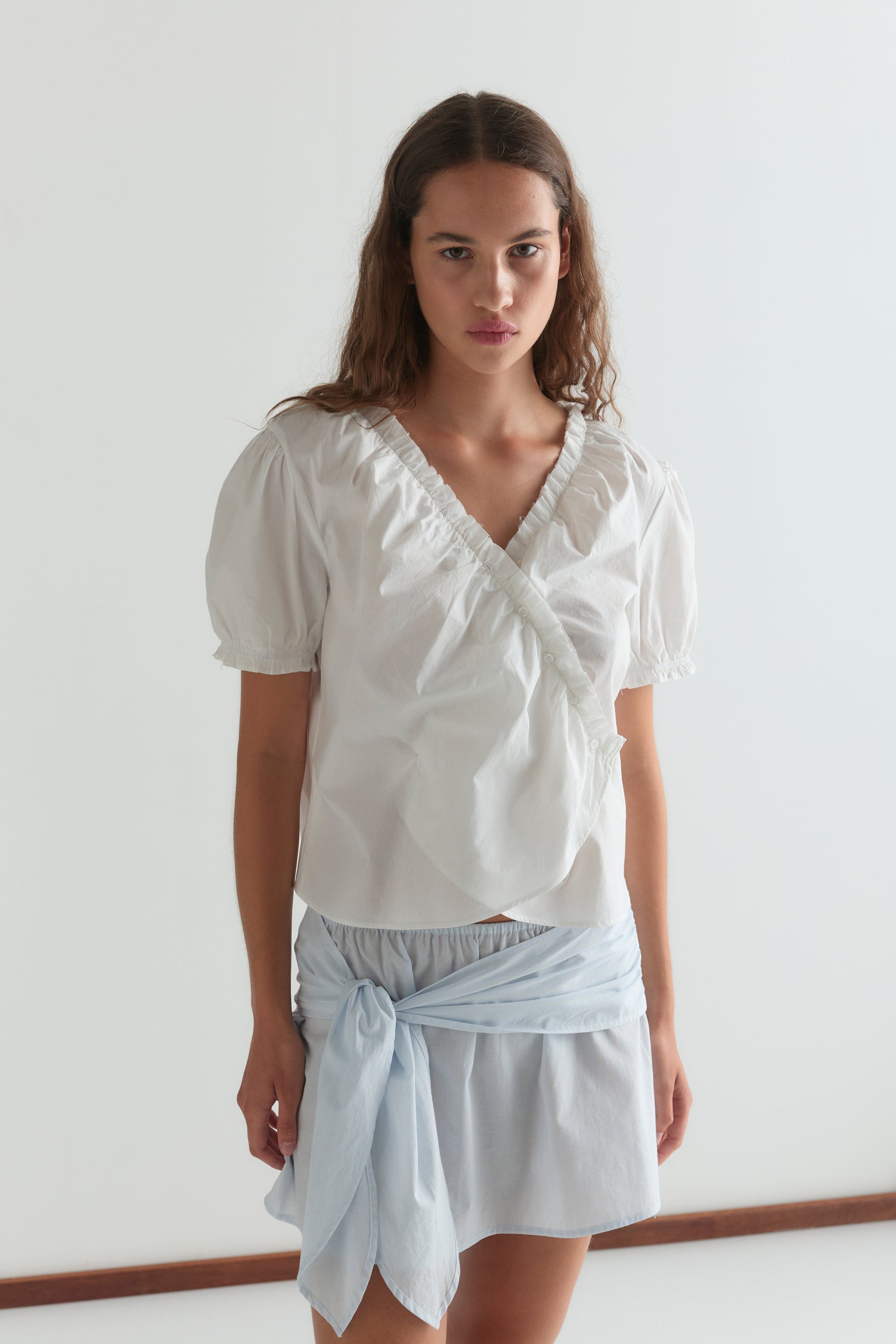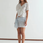 A chic cross-front short sleeve shirt with a gathered frill V-neckline and button closure. Features gently puffed sleeves, elasticated frill cuffs, and a cropped relaxed silhouette that effortlessly elevates your everyday wardrobe with contemporary style and feminine detail.