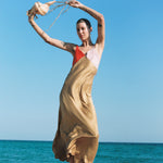 The Deco Ruched Dress in Snapper by Silk Laundry.