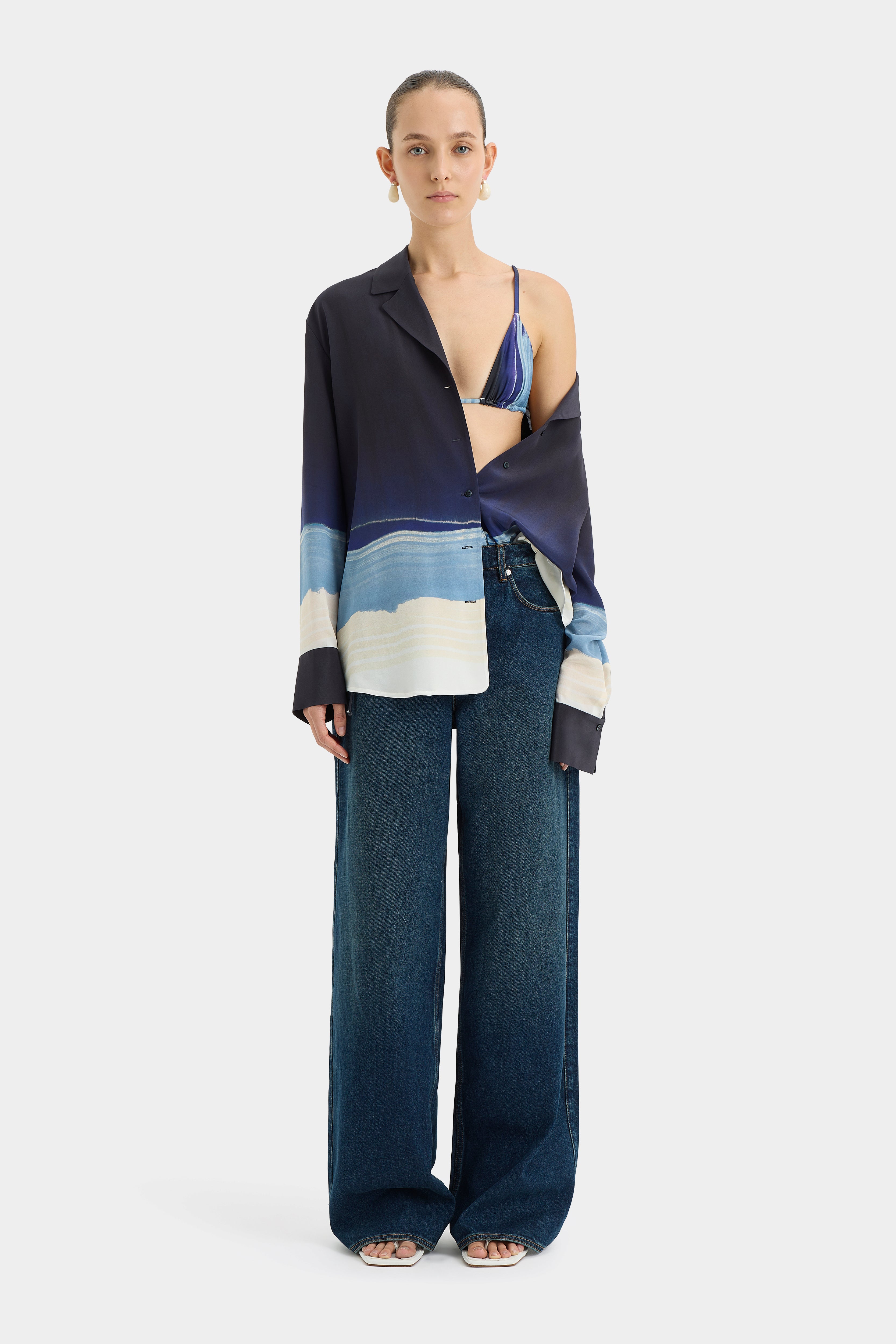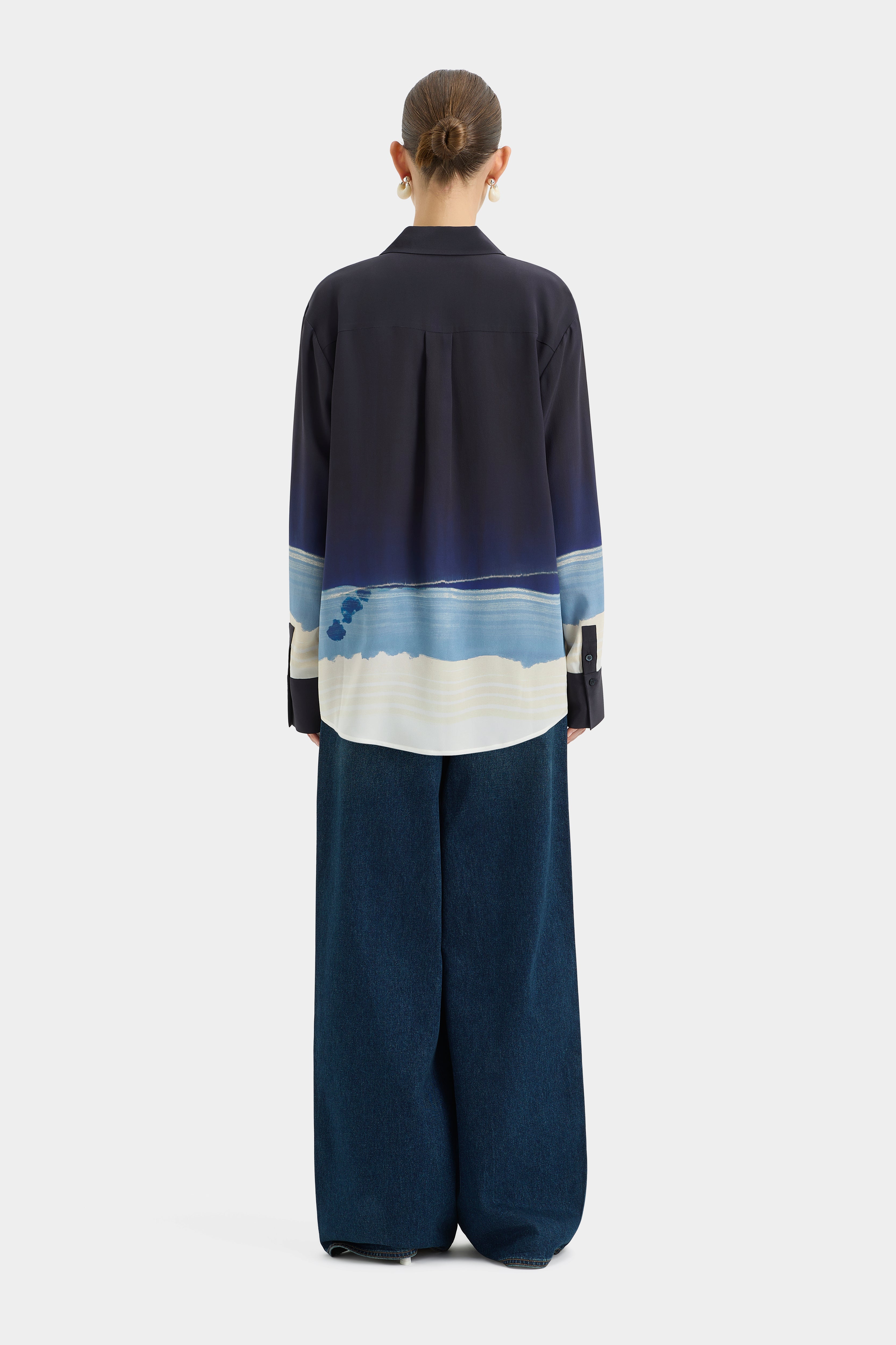 The Mariner Shirt by SIR. is a relaxed long sleeve shirt crafted from lightweight silk crepe de chine, in our exclusive in an exclusive Shoreline Stripe print inspired by undulating seascapes. Featuring an open collar design and a button front detailed with SIR. logo buttons in a pearl finish.
