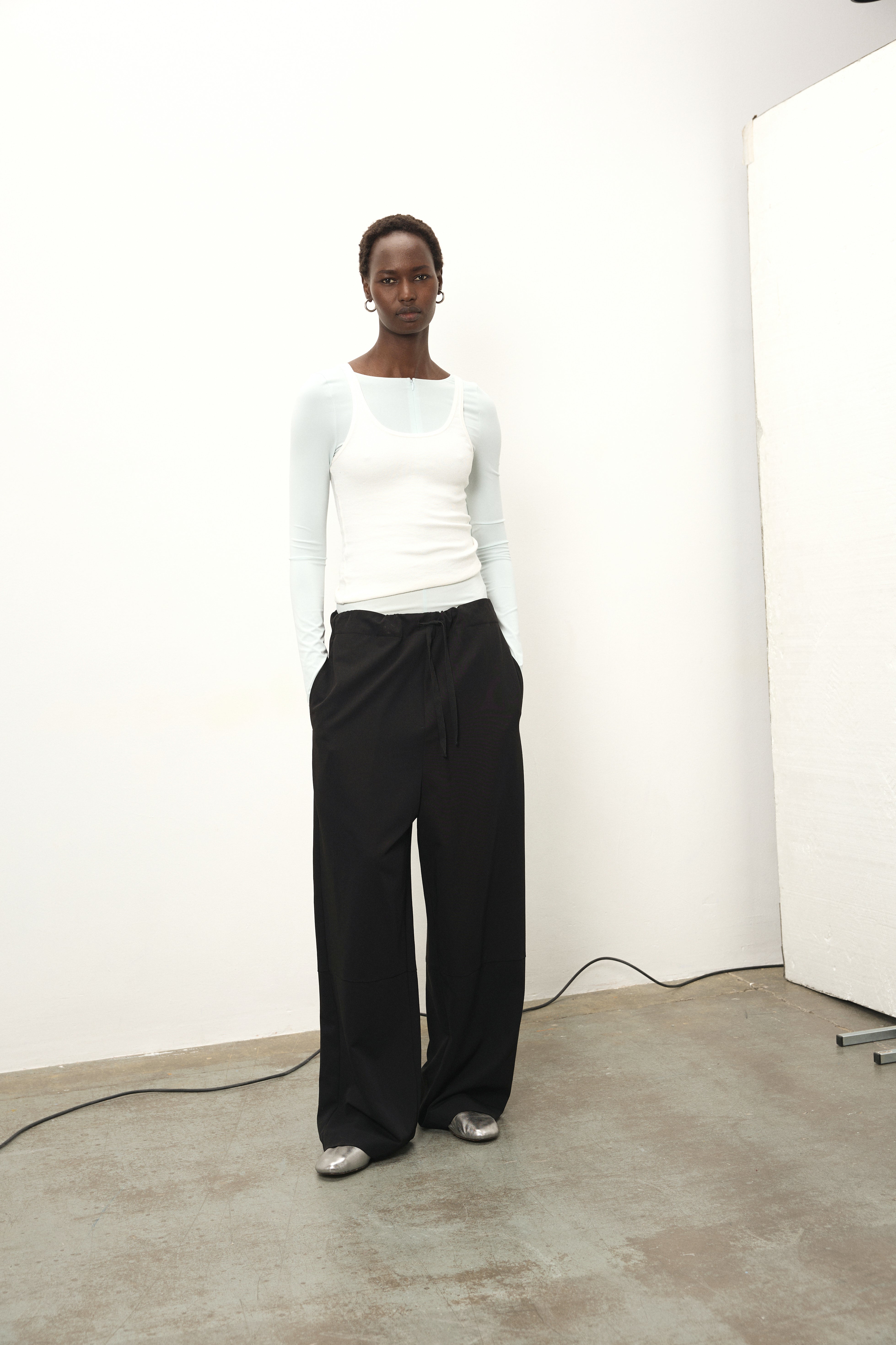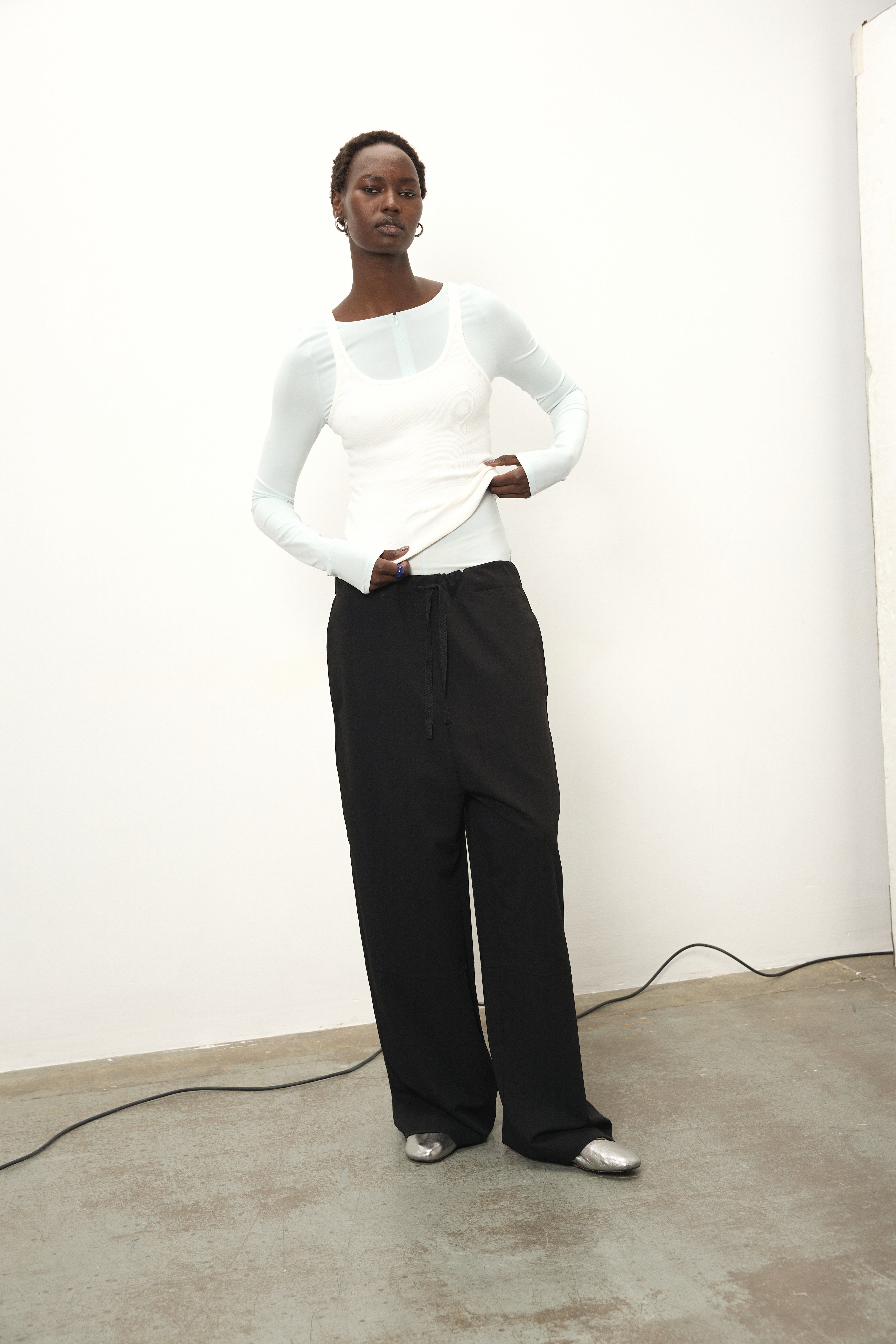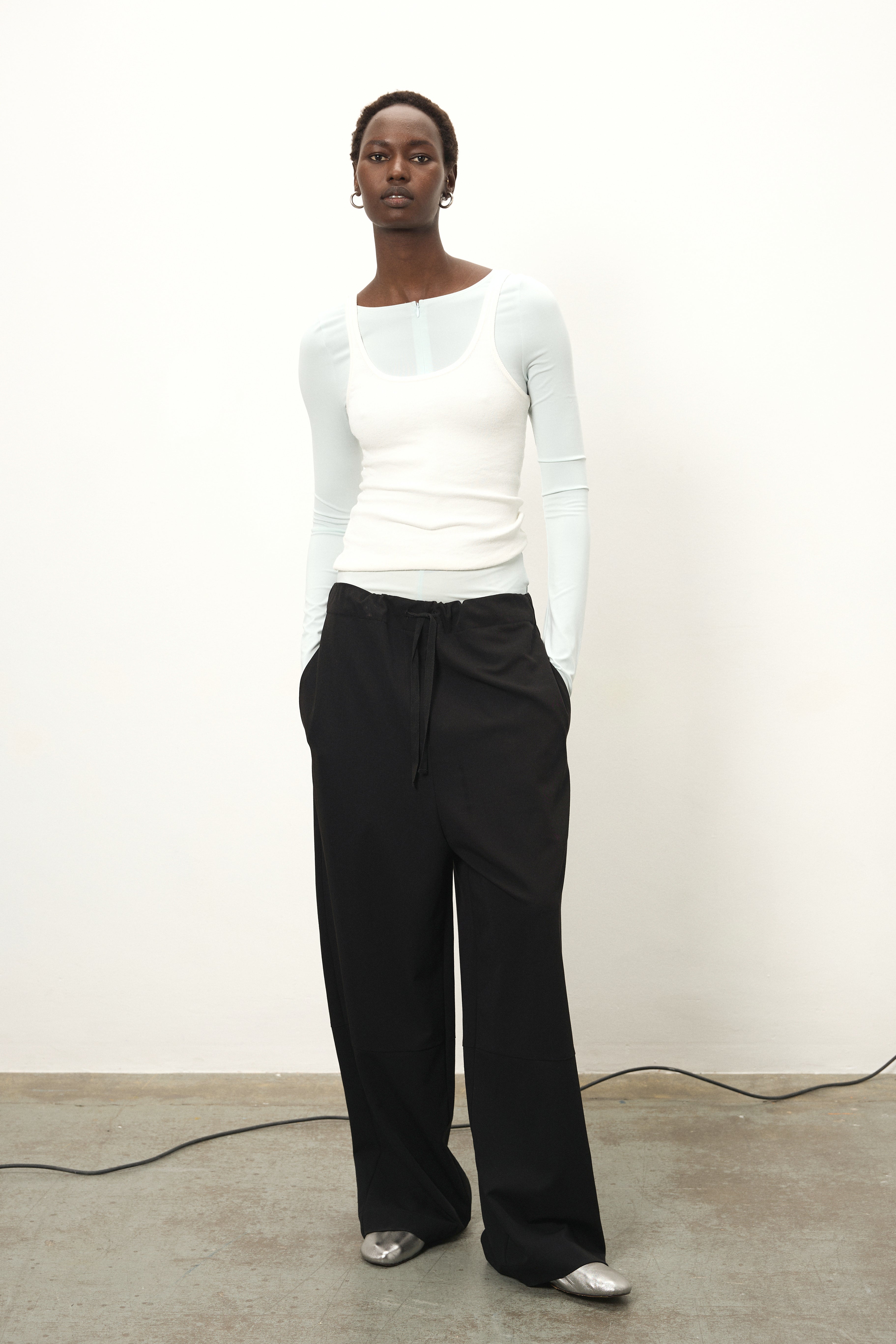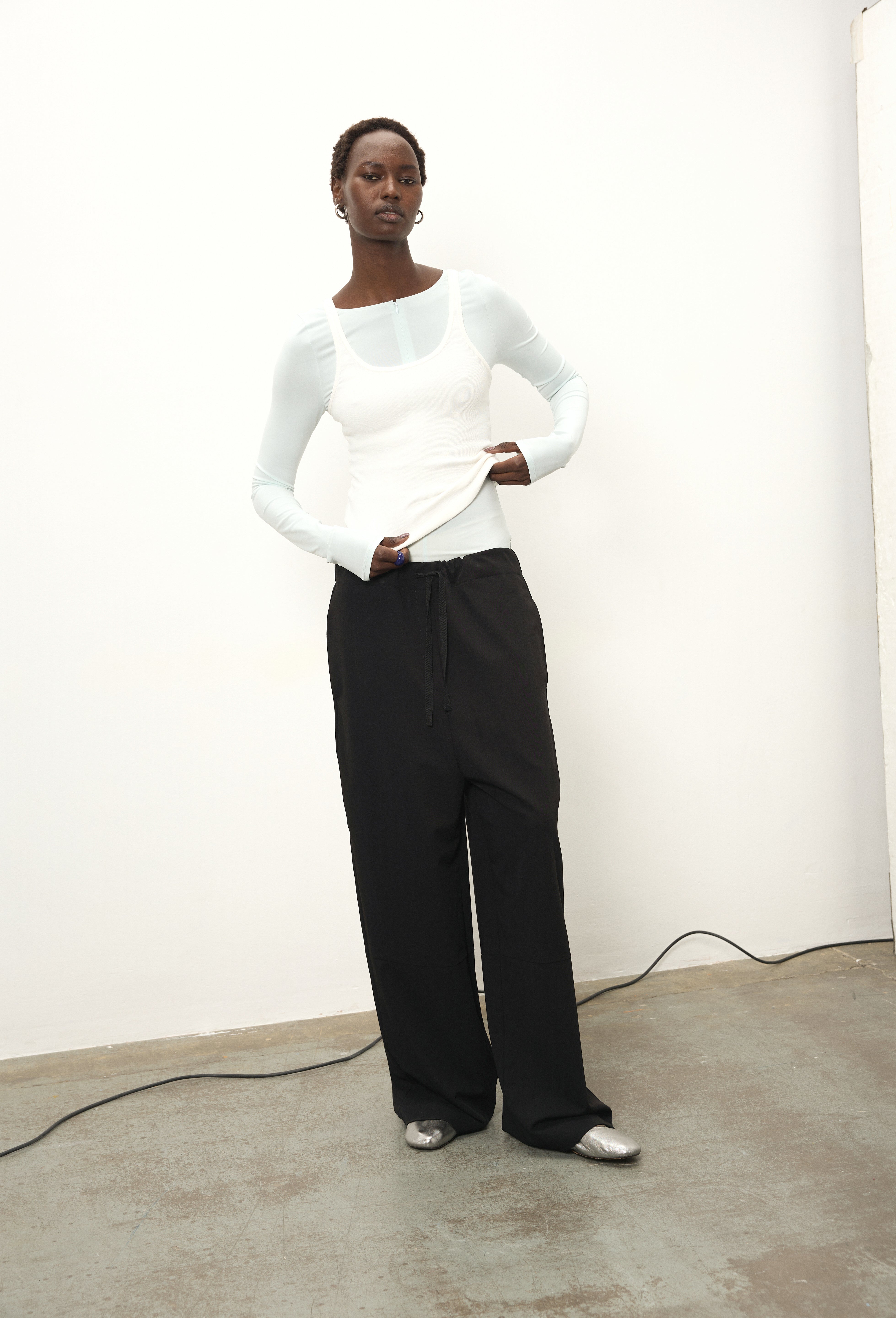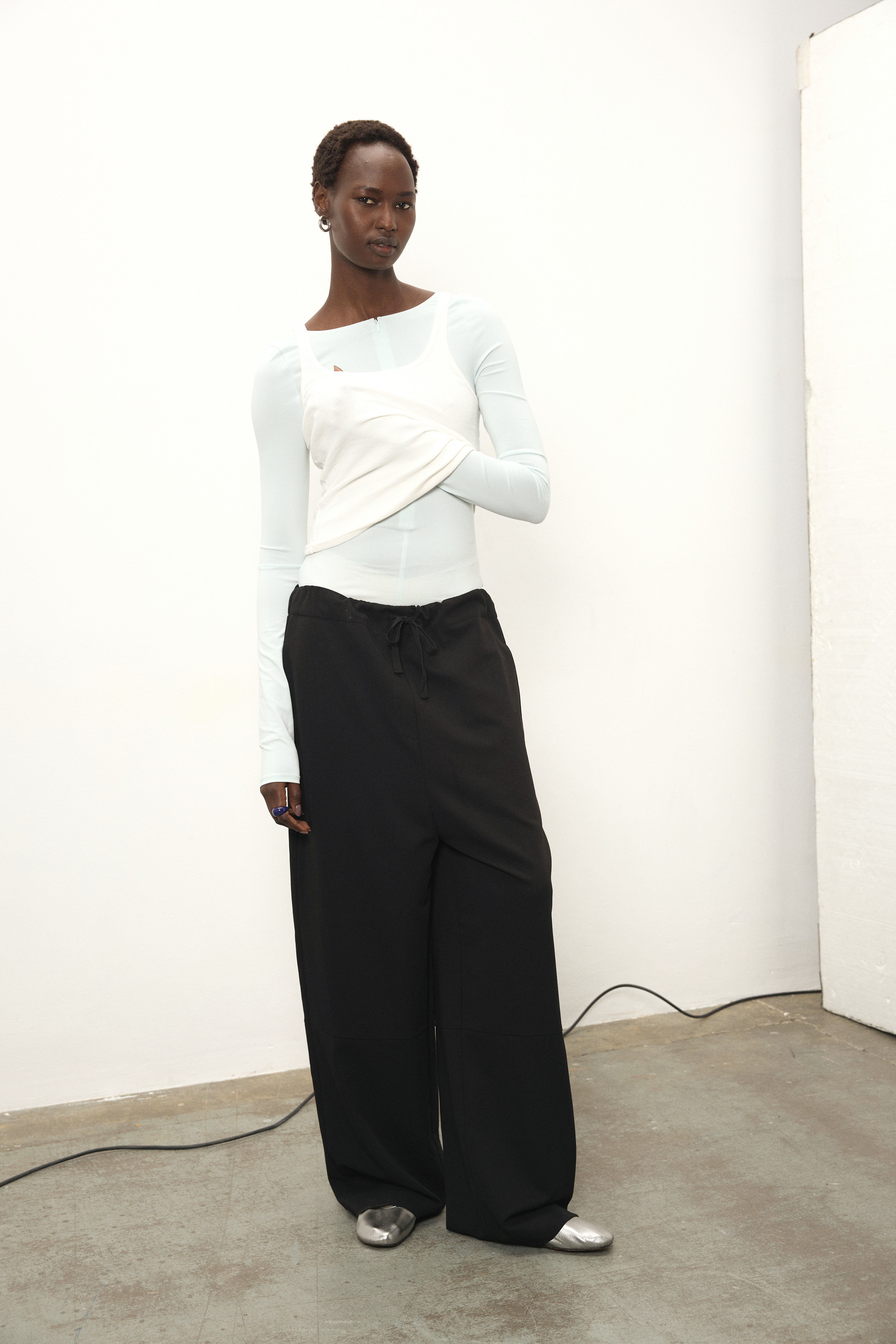 The Elemental Parachute Pants in Black have an effortlessly cool oversized silhouette with an elasticated bungee cord waistband, functional side and back pockets, and adjustable lower leg snaps for that refined parachute pant aesthetic.