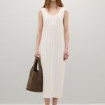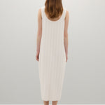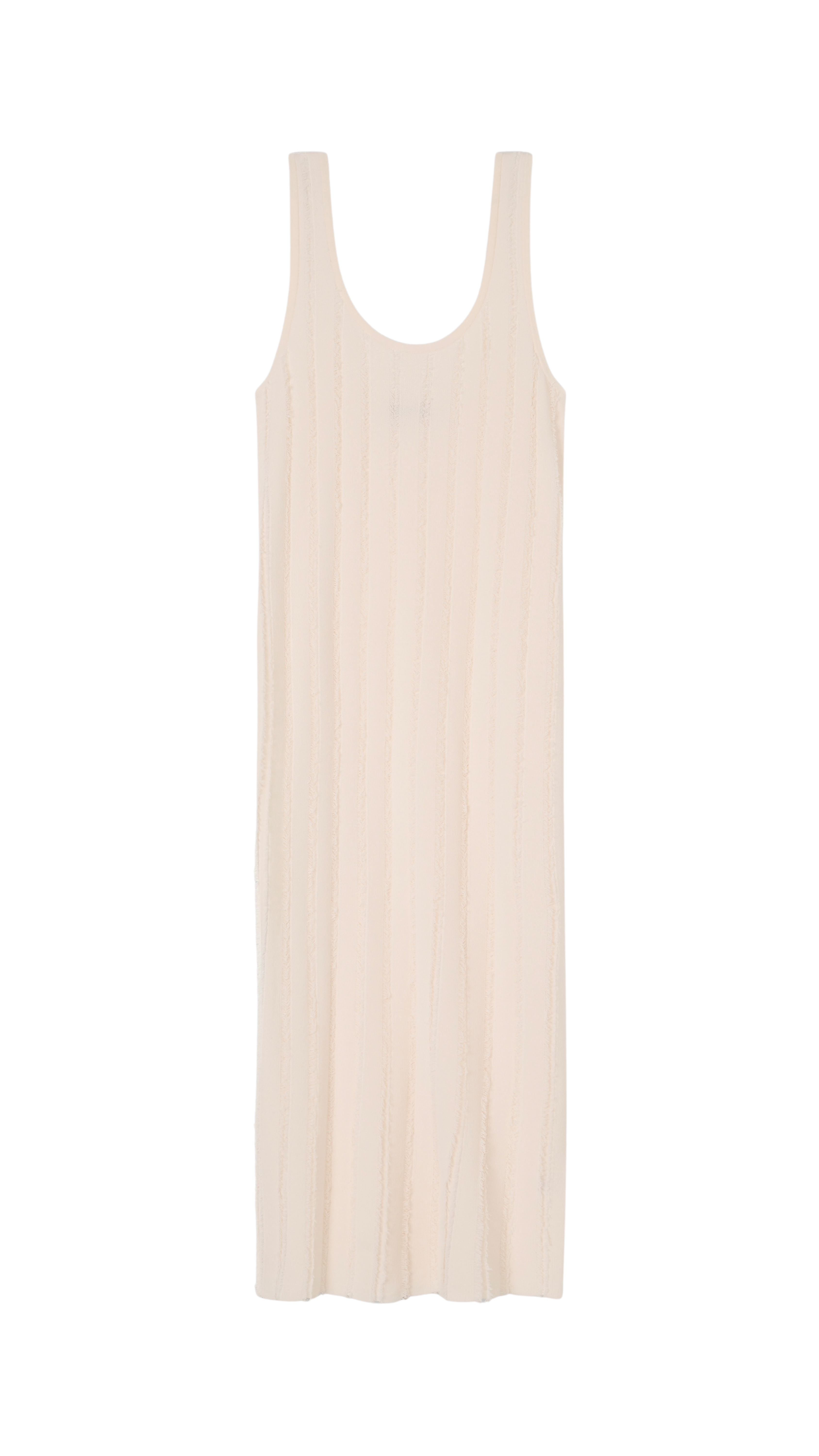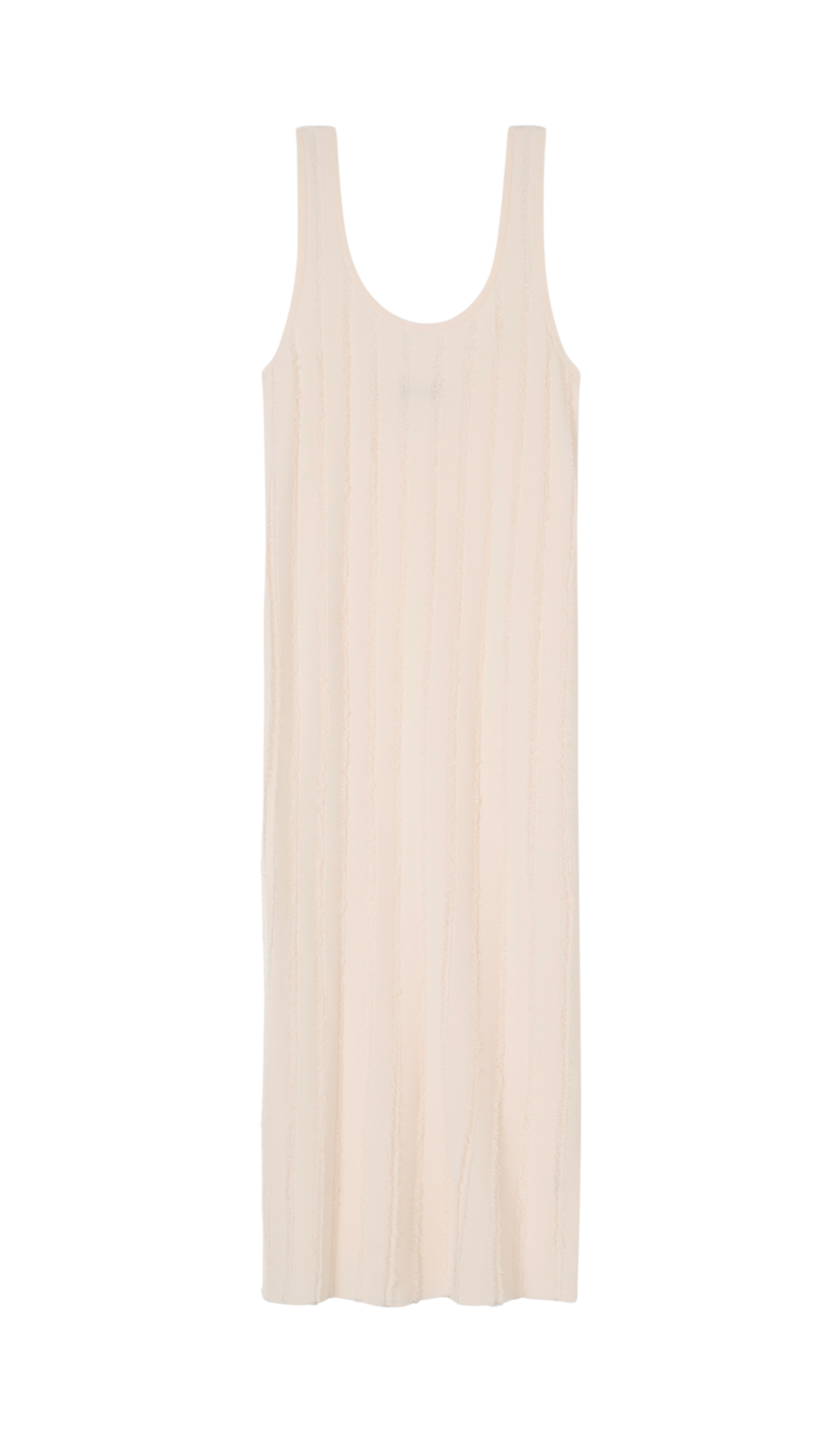 The Enid Dress features a fringe knit fabric uniquely created by the A.EMERY team. With its timeless tank straps and flowing, elongated silhouette, this piece is perfect for warm days, offering a chic and easy-to-wear option for your seasonal wardrobe.