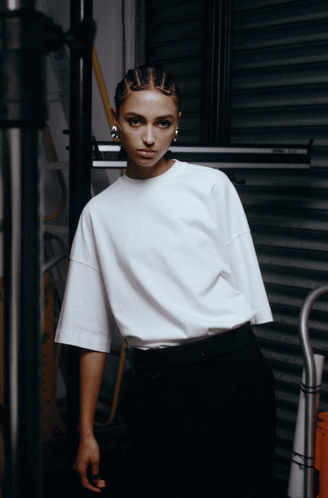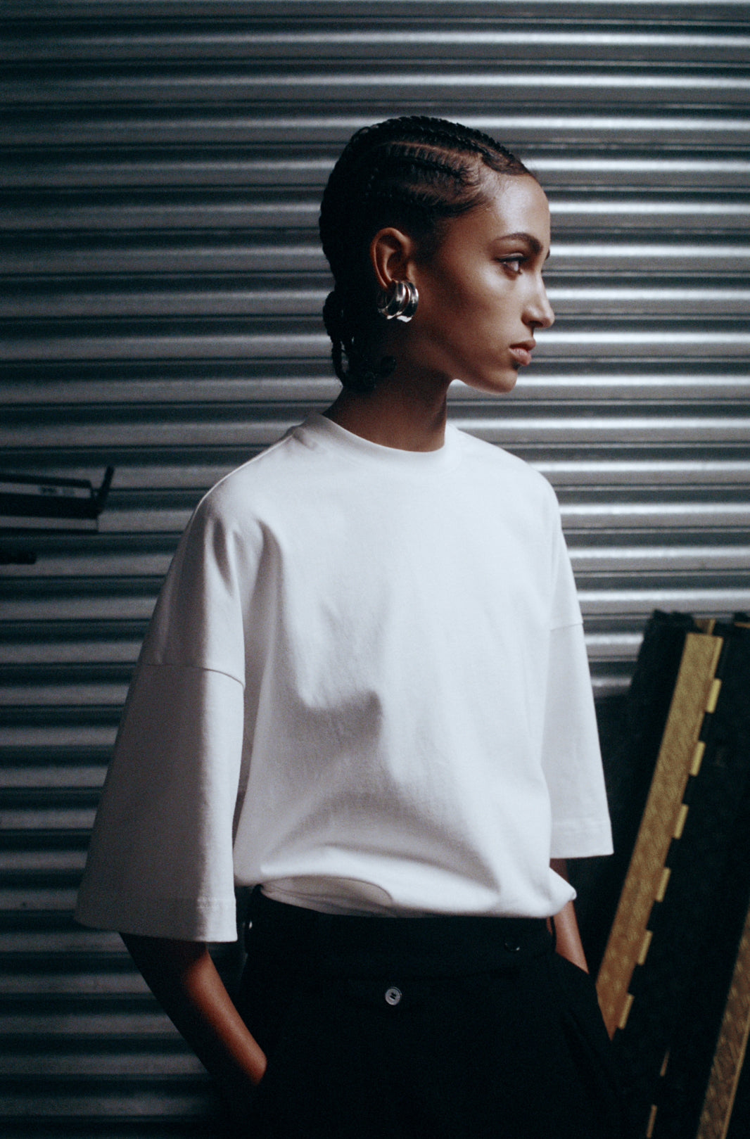 The aspirational meets the everyday. Cut in brushed cotton with a suede-like hand-feel. Drop shoulders and elbow grazing sleeves are intentionally designed for an oversized fit.