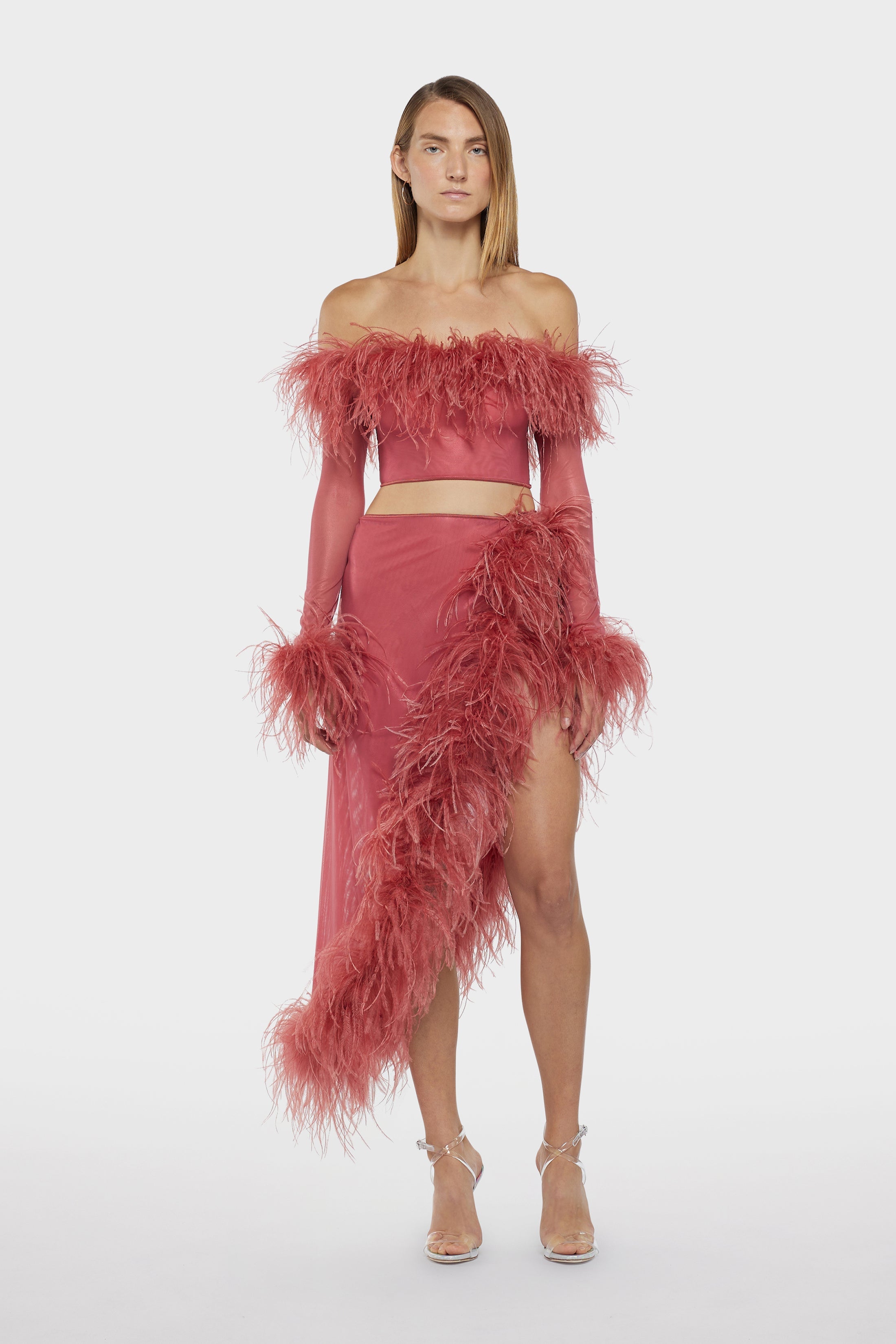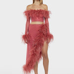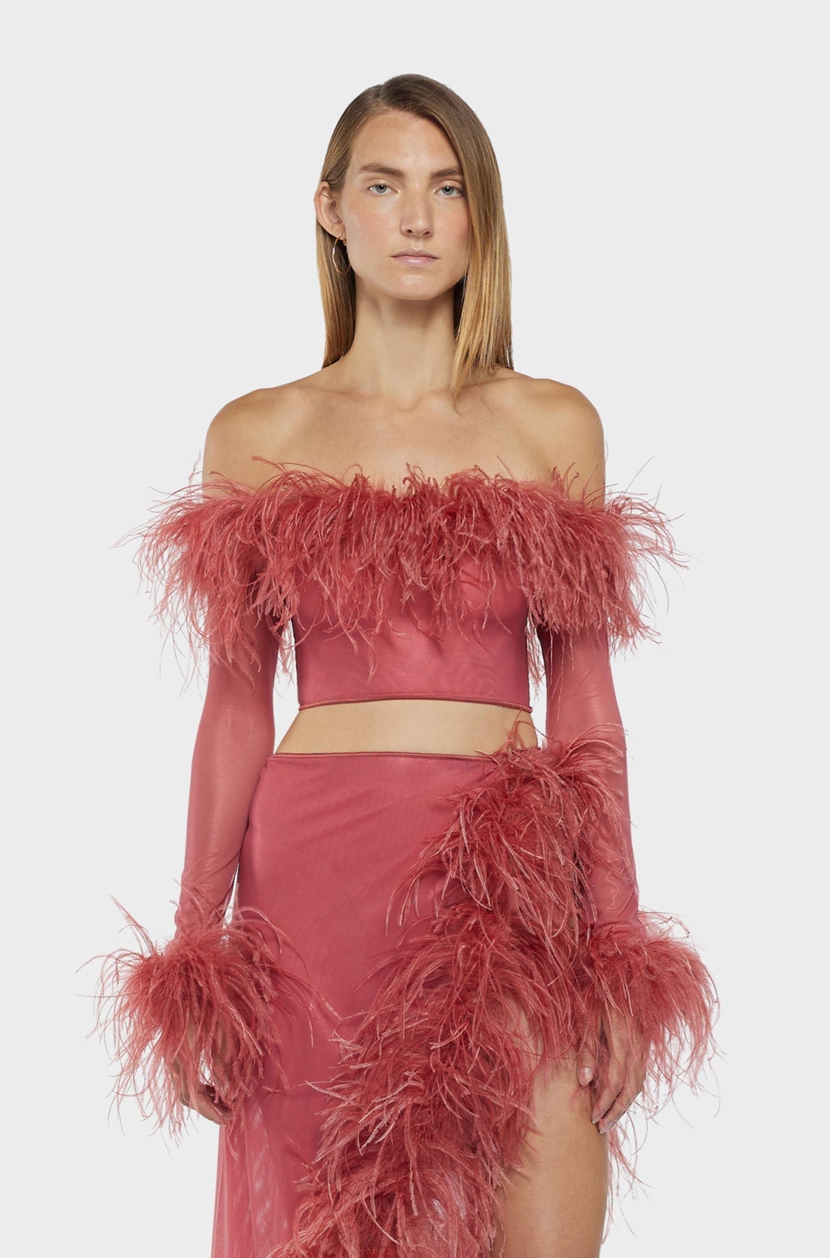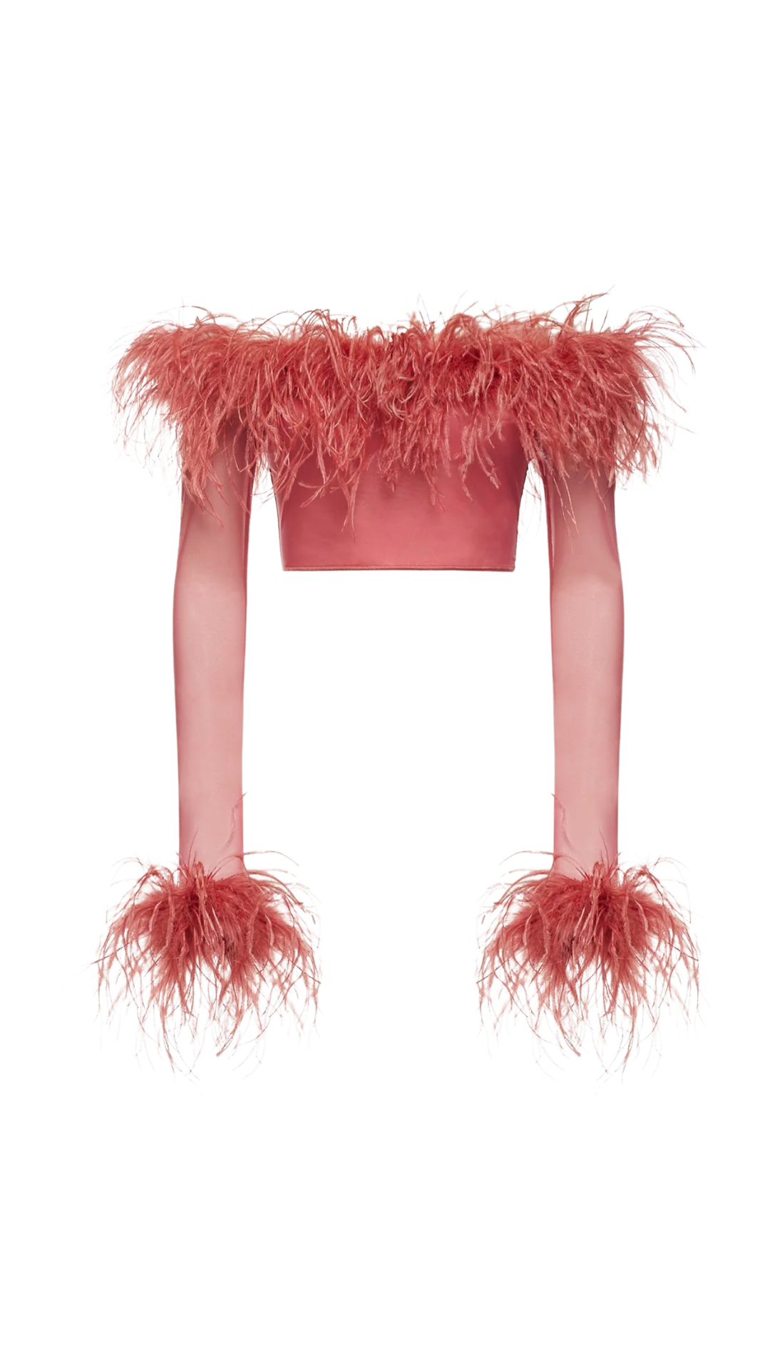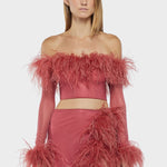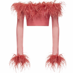 Lightweight yet luxurious, the Lame Plumage Top features real ostrich feathers and a mesh fabric for a unique look that's both playful and elegant. Perfect for adding a touch of texture and sophistication to any outfit, this top boasts long sleeves, a cropped length, and feather trim at the top and sleeve cuffs.