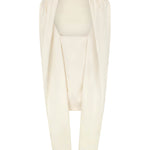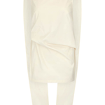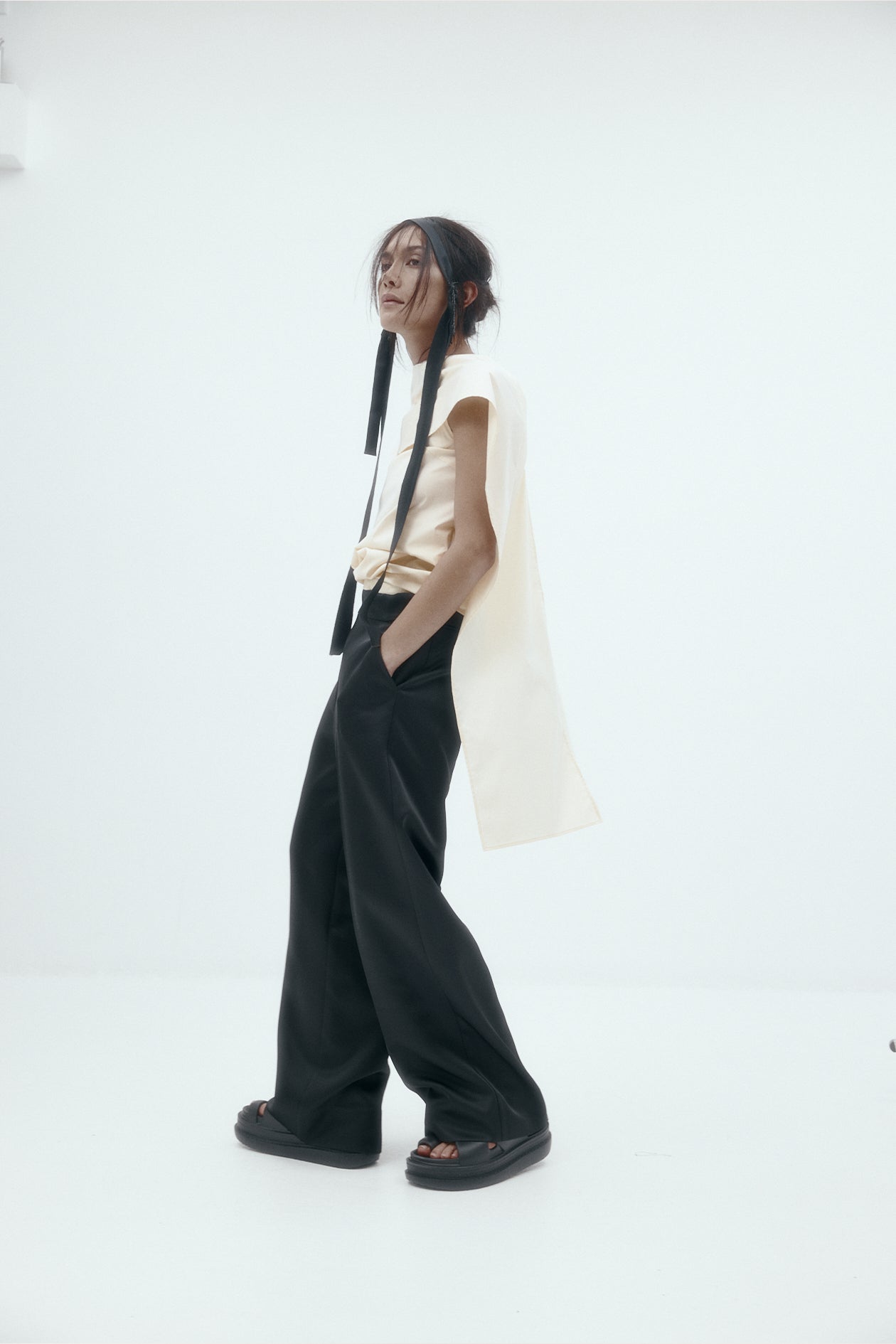 A sculptural silhouette built in tech taffeta with tuck detailing at the waist. Sash panels drape across the shoulders, cascading down the back or tying softly into a half knot.
