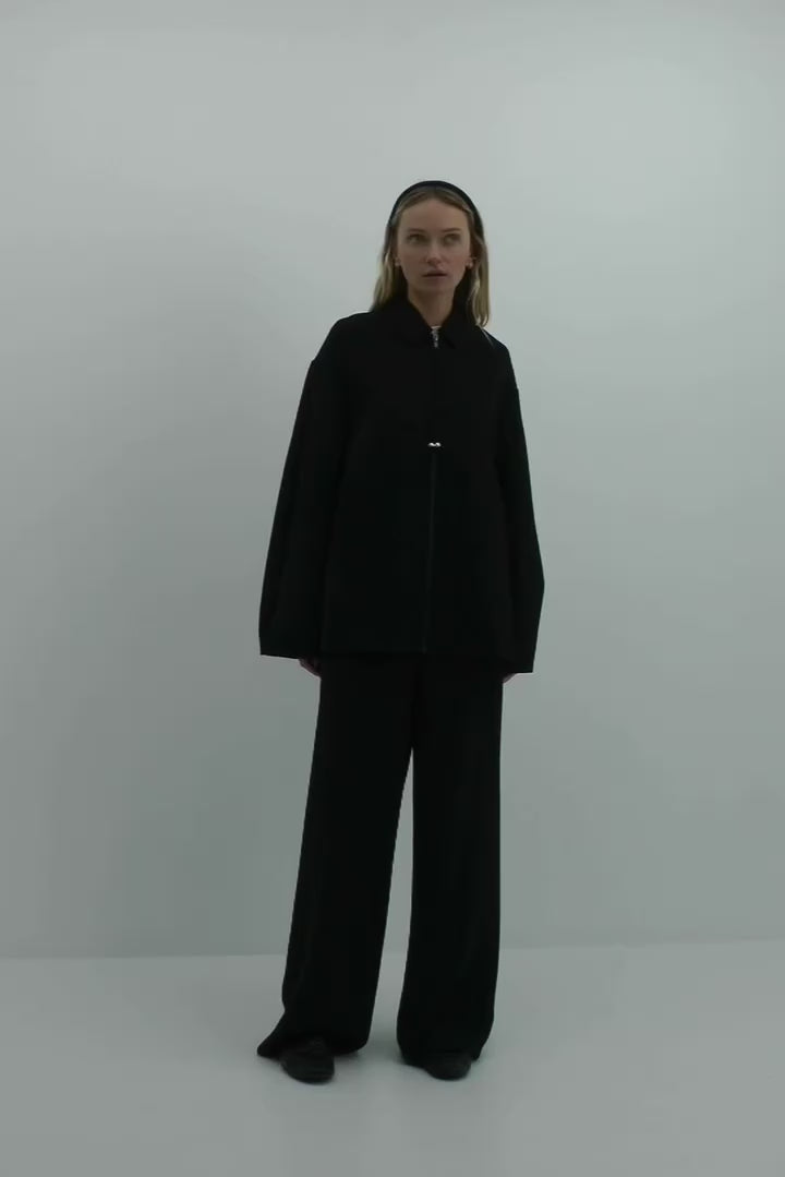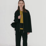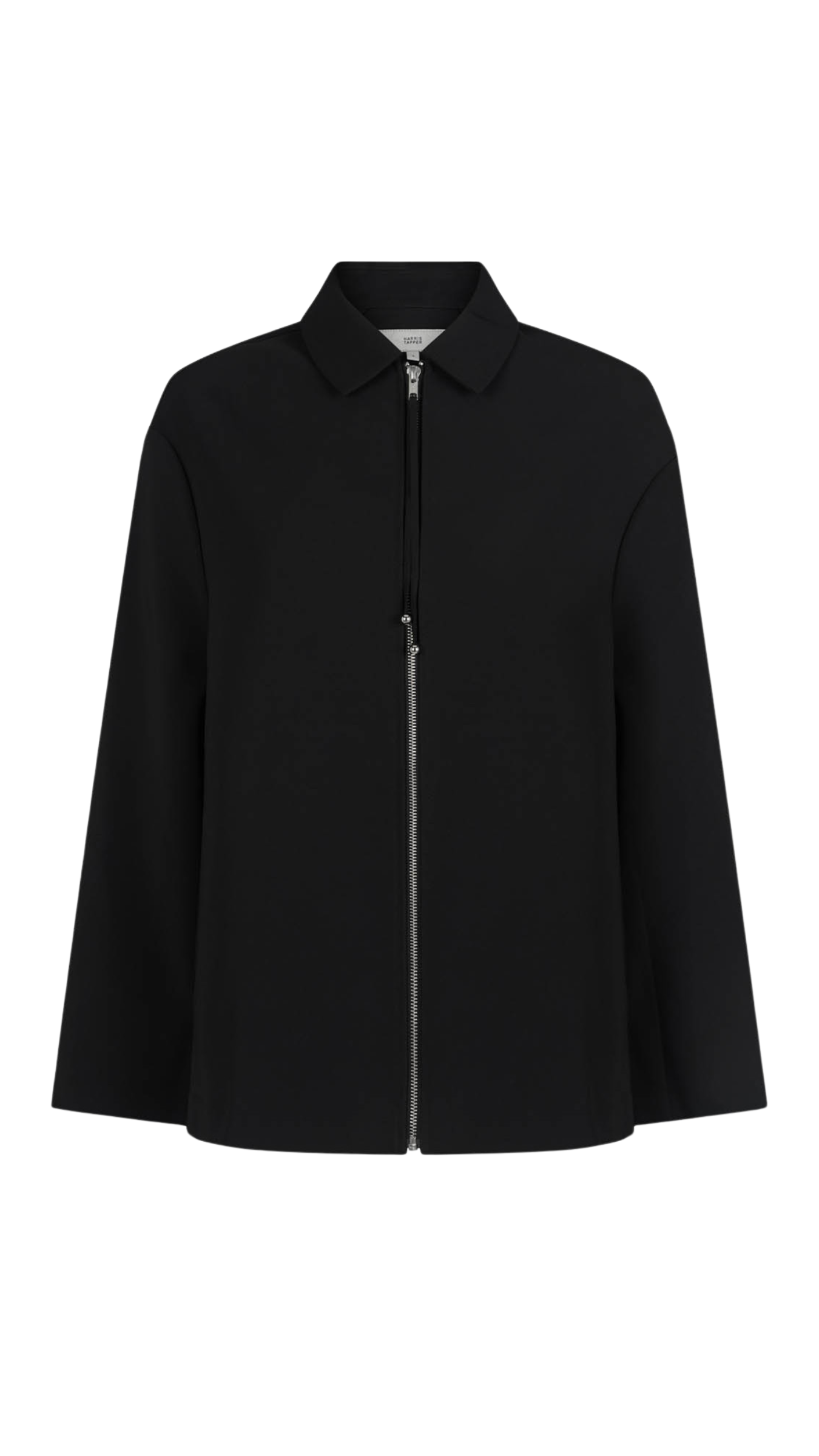 An a-line style jacket featuring a centre zip with tassel detail. Finished with a pointed collar, dropped shoulders and elongated sleeves.