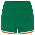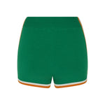 Superfine Merino Wool blend knitted mini shorts with intarsia side and hem stripe and rib waistband. Features colourblock striped panels at side seam and bottom hem. This garment is fully fashioned/engineered to shape, meaning there is minimal yarn wastage during the production process.